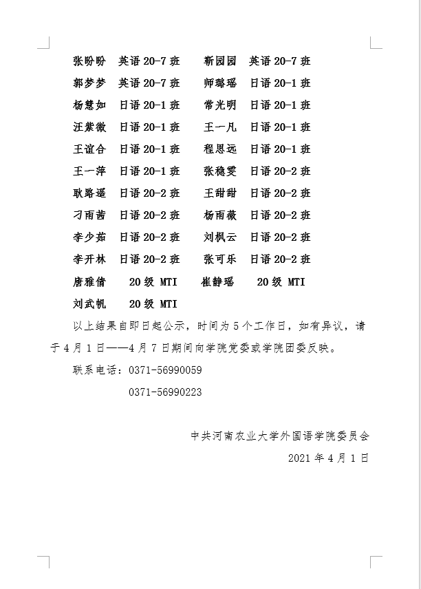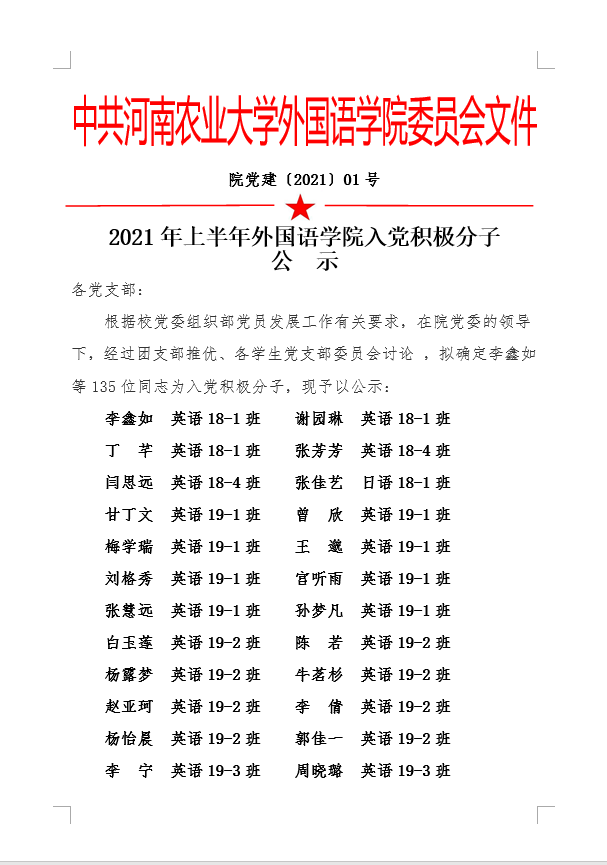 2021年上半年外国语学院入党积极分子公示
