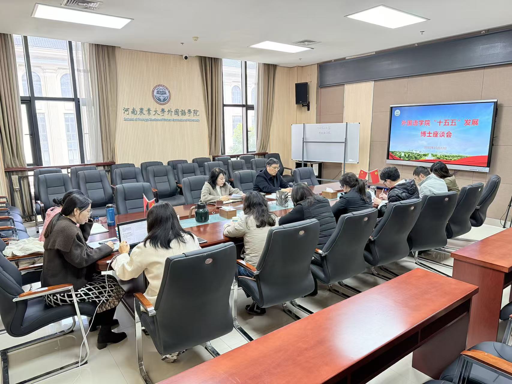 本网讯(审稿:王燕萍 供稿:冯超)为科学谋划“十五五”时期发展蓝图,10月23日,外国语学院组织召开博士教师座谈会,院党委书记王燕萍、院长张俊杰出席会议,与来自各系部的十余名博士教师代表深入交流,听取意见建议,共商学院未来发展大计。