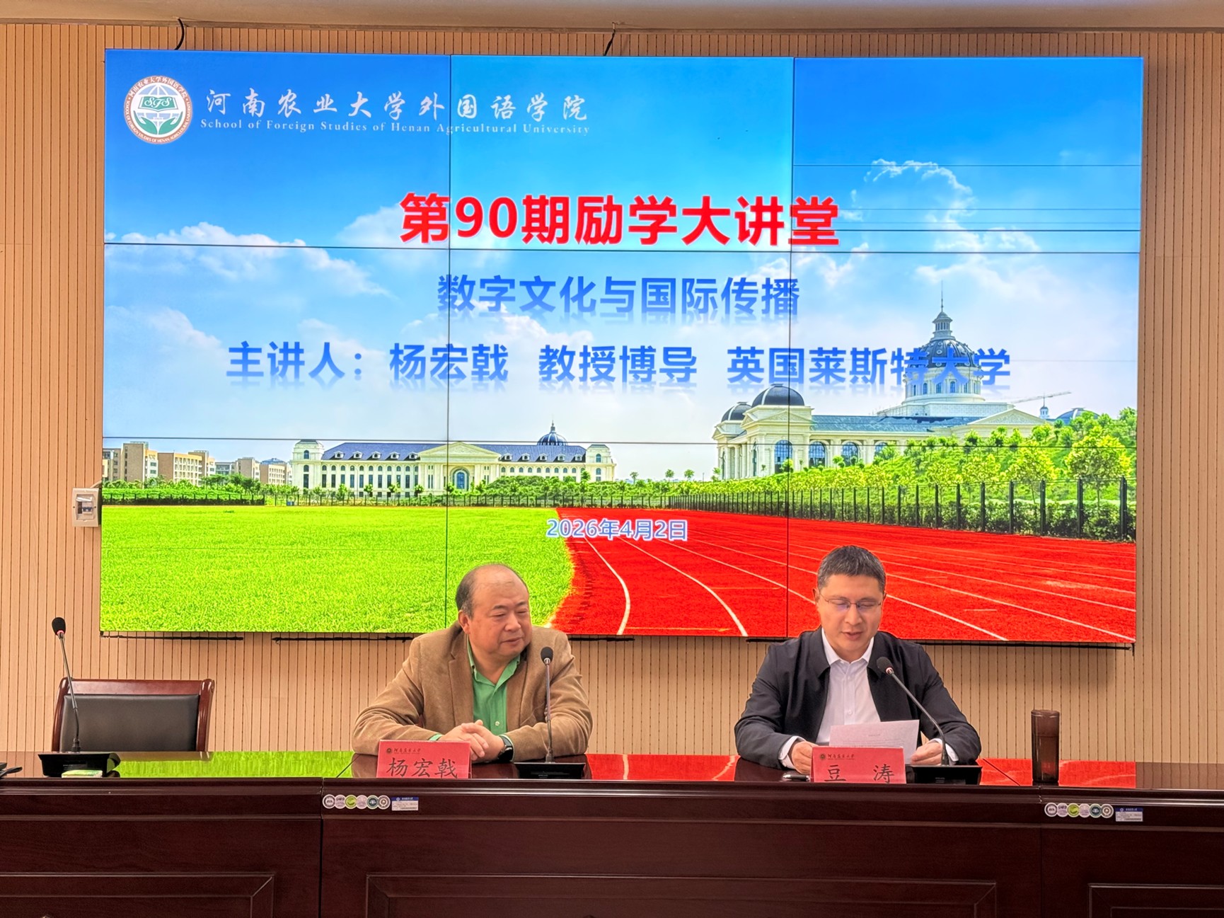 本网讯(审稿:豆涛 供稿:刘甜)4月2日,英国莱斯特大学教授、博士生导师杨宏戟应邀做客外国语学院第90期“励学大讲堂”,并作了题为“数字文化与国际传播”的学术报告。报告会由副院长豆涛主持,学院骨干教师、研究生及本科生代表参加。