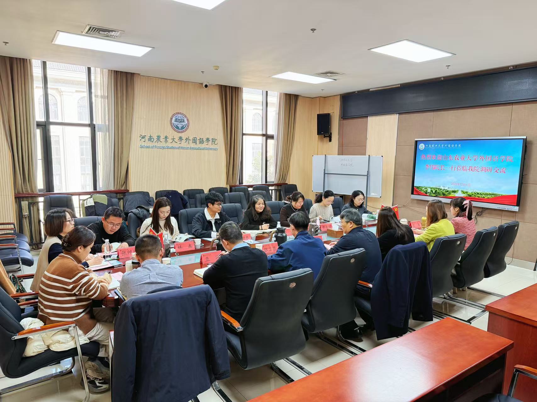 本网讯(审稿:张俊杰 供稿:薛杰)12月4日,山东农业大学外国语学院院长李伟一行莅临我院,开展调研交流活动。我院院长张俊杰携班子成员、系部主任及教师代表参会,会议由张俊杰主持。