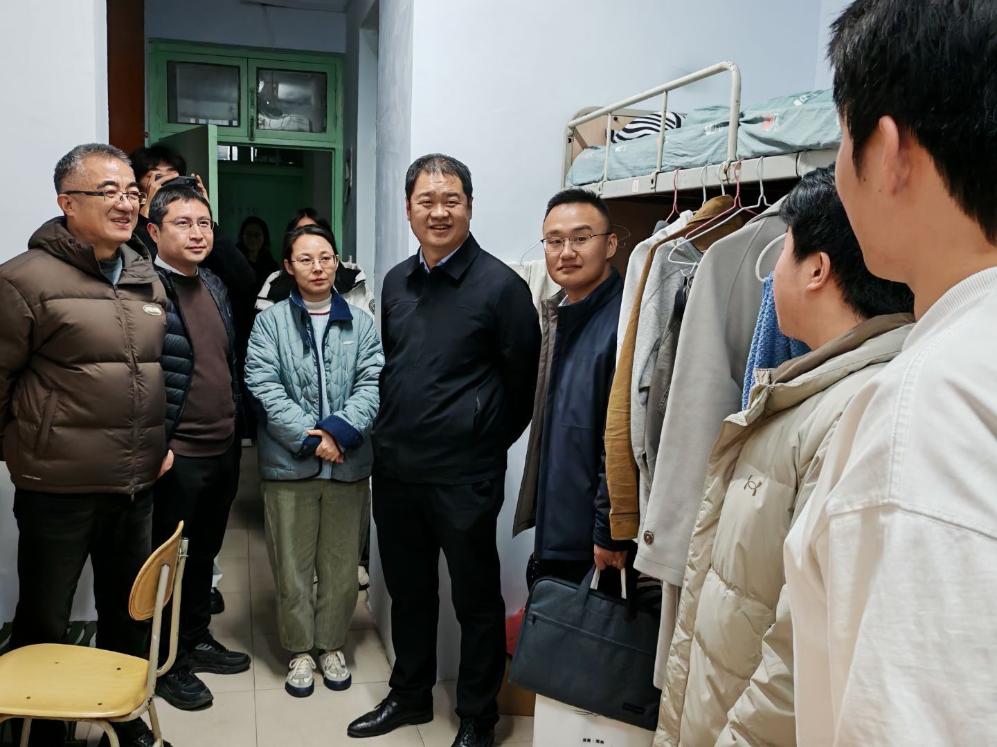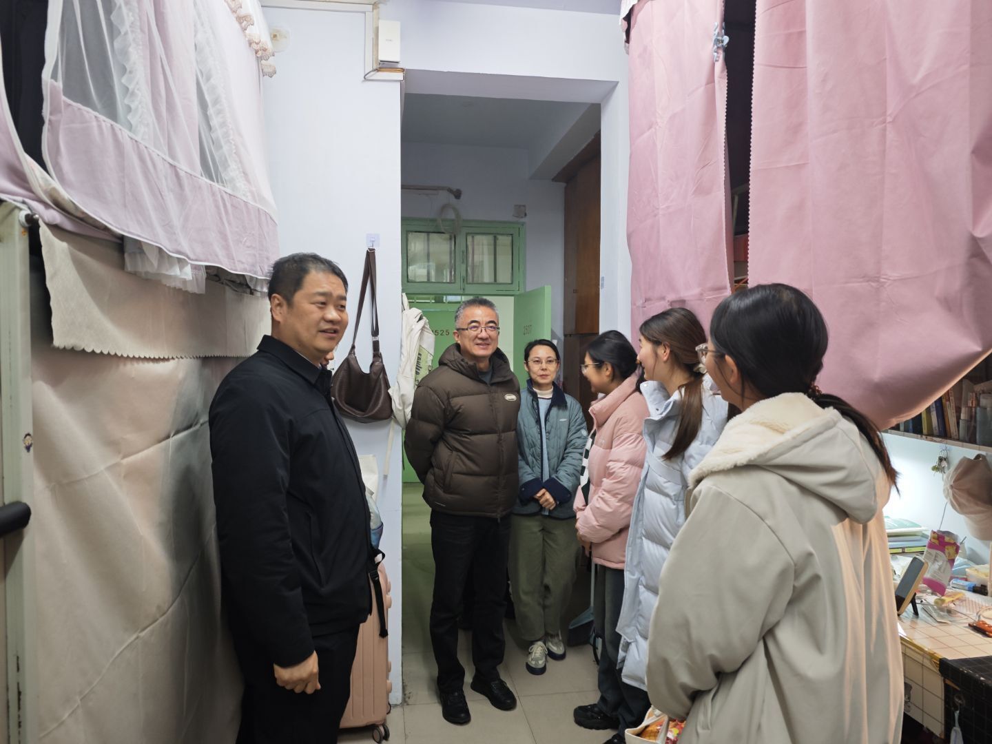 本网讯(审稿:张玥 供稿:冯超)岁末寒冬,期末将至。2025年12月29日,外国语学院党委书记王启佩、院长屠克携领导班子成员深入桃李园学生宿舍,看望慰问2025级学生,在送上冬日温暖的同时,也带去诚挚的新年祝福与期末备考的关怀鼓励。