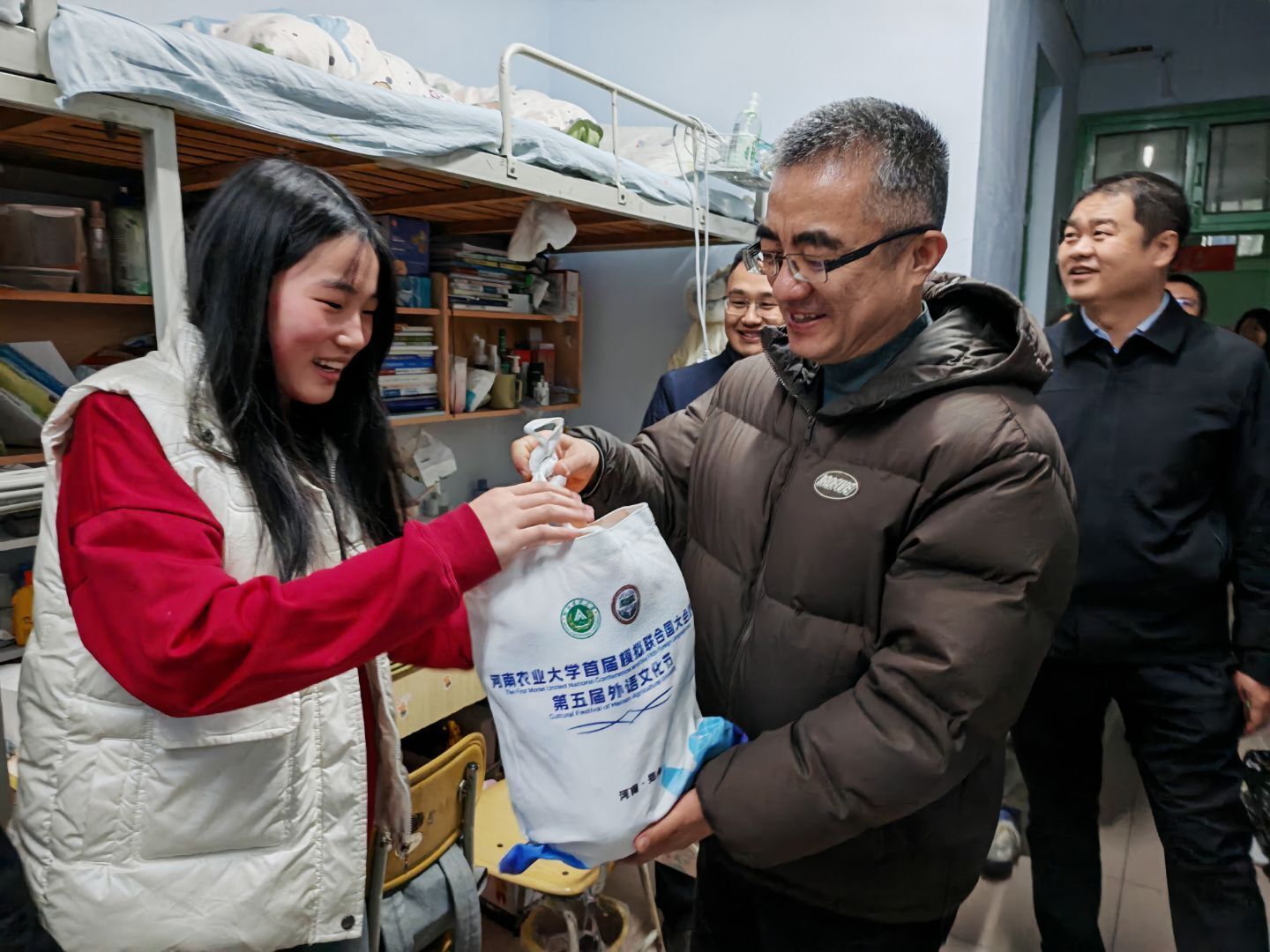 “生活上有什么困难没有?”“期末考试准备得怎么样了?”每走进一间宿舍,学院领导都亲切与同学们交流,为大家送上寓意平安喜乐的水果礼包。王启佩细心查看住宿环境,关心同学们的学习进展与生活情况。他勉励同学们在认真复习备考的同时,也要劳逸结合,保持积极心态;新的一年要树立新目标,珍惜大学时光,积极参与实践,不断提升综合能力。屠克关切询问同学们在专业学习上是否存在困难,并现场解答了关于课程设置、复习方法等方面的问题,他建议同学们加强师生沟通,扎实掌握专业知识,以自信从容的姿态迎接考试。