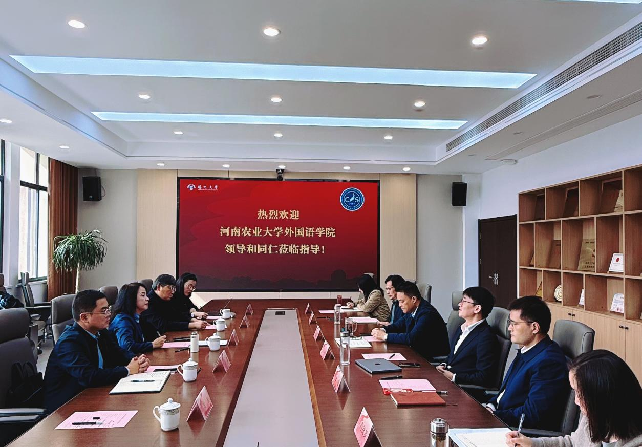王燕萍向扬州大学外国语学院的热情接待表示感谢,介绍了河南农业大学及农大外国语学院的基本情况,尤其是在学校”双一流“创建进程中外国语学院在国际传播和“讲好河南故事”方面的探索与创新。张俊杰说明了此次学习调研的目的。他表示,扬州大学外国语学院历史悠久,学术氛围浓厚,在党建工作、学科建设、科学研究、人才培养模式创新等方面值得我院深入学习。他特别提及扬州大学外国语学院对我院副院长吴玲于该校攻读博士学位期间给予的精心指导与培养,并代表学院表达了诚挚的感谢。杨鑫介绍了我院基于校本特色开展的系列学生工作,以及师生共同在竞赛和项目中取得的成绩。吴玲对扬州大学外国语学院在双学位与微专业建设中的创新实践表达了高度赞赏及交流意愿。