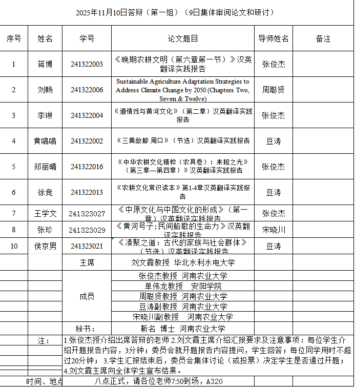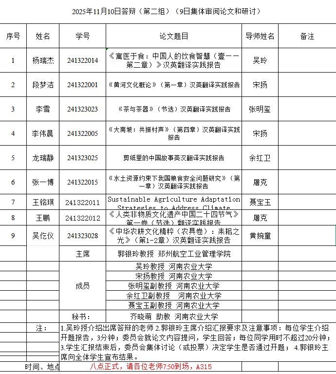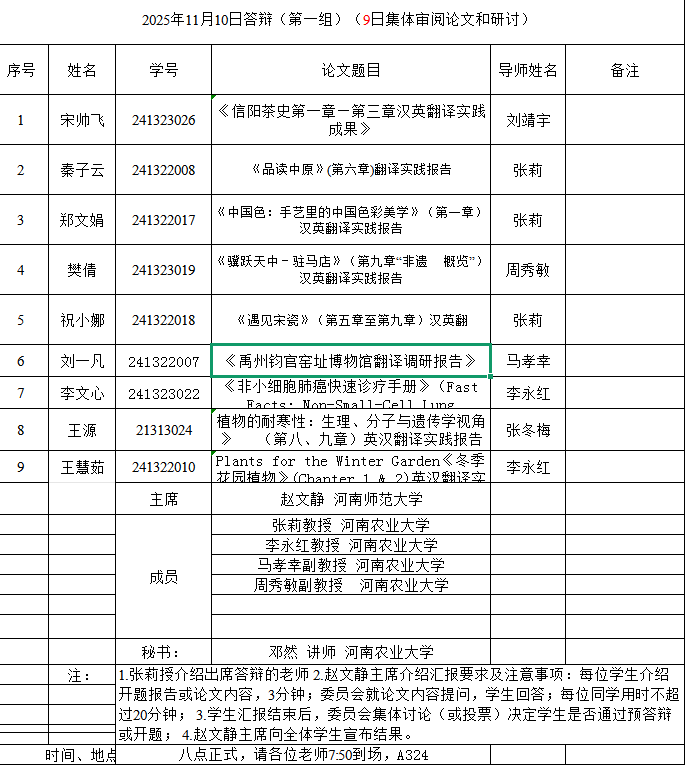 本网讯(审稿:吴玲 ;供稿:马孝幸;摄影:邓然 靳名 齐晓萌 )11月9-10日,我院组织开展了2025年英语笔译专业研究生学位论文开题报告和预答辩暨中期考核论证会。本次论证会特邀河南师范大学赵文静教授、华北水利水电大学刘文霞教授和郑州航空工业管理学院郭银玲教授分别担任论证小组主席,安阳学院院长单伟龙教授和我院硕士生导师担任委员,1名研究生参加预答辩暨中期考核,26名24级研究生参加开题。