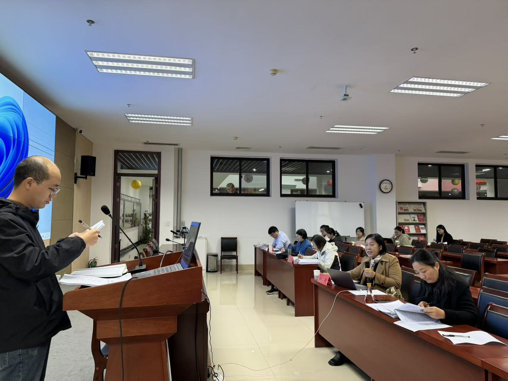 论证会上,三位主席宣布论证流程。参加开题及中期考核的研究生依次阐述了论文的选题背景、研究意义、论文框架、理论基础和论文完成情况等。委员会秉持严谨负责的学术态度,提出具有针对性、建设性的问题及修改建议,学生认真回答了委员会的提问。论证全程严肃紧张、有条不紊。最后,经委员会集体投票决议,1名研究生通过预答辩暨中期考核,26名研究生通过开题。