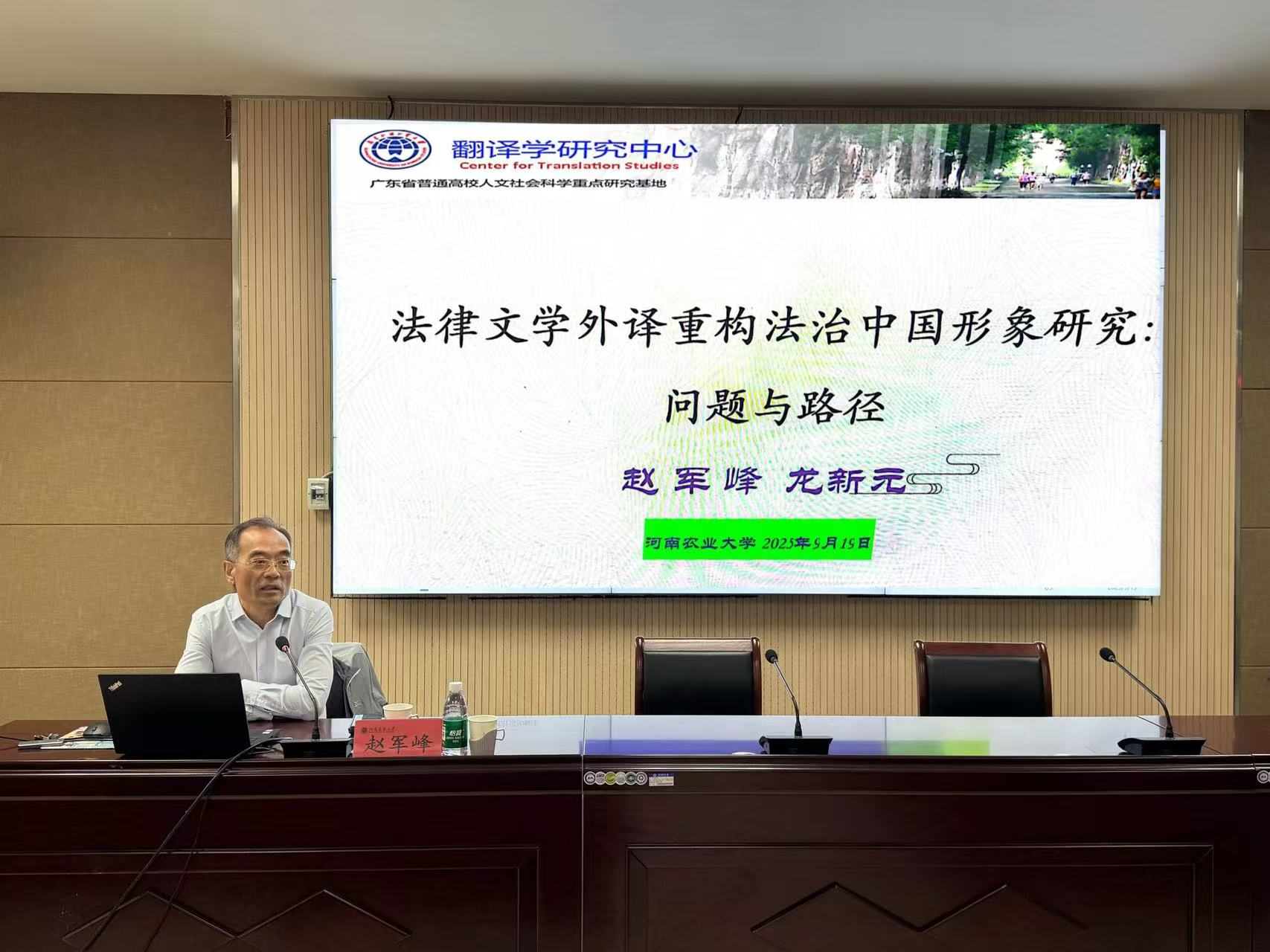 本网讯(审稿:吴玲;供稿:马孝幸;摄影:黄彪)9月19日,全国翻译专业学位研究生教育指导委员会副主任委员、广东外语外贸大学二级教授、博士生导师赵军峰博士应邀做客外国语学院第86期励学大讲堂,分别做了题为“MTI学位论文写作:原则与应用”和“法律文学外译重构法治中国形象研究:问题与路径”两场报告会。报告会由院长张俊杰教授主持,硕士生导师和全体研究生、本科生代表参加了此次报告会。