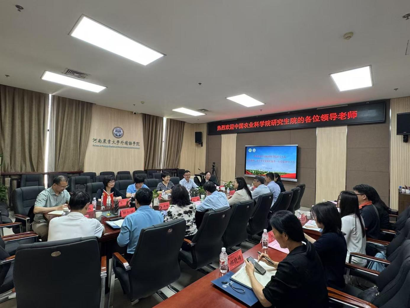 赵鹏向温洋一行的到来表示热烈欢迎,并简要介绍了河南农业大学研究生教育教学与人才培养的基本情况,向中国农业科学院研究生院长期以来对中国现代农业联合研究生院的工作的关心和支持表示感谢,希望相关学院和部门积极主动,进一步扎实做好融合发展的各项工作。