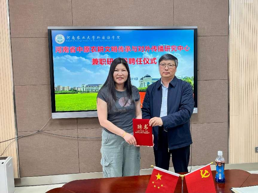 在报告开始前,张俊杰代表学院向李艳教授颁发“河南省中原农耕文明传承与对外传播研究中心”兼职研究员聘书。