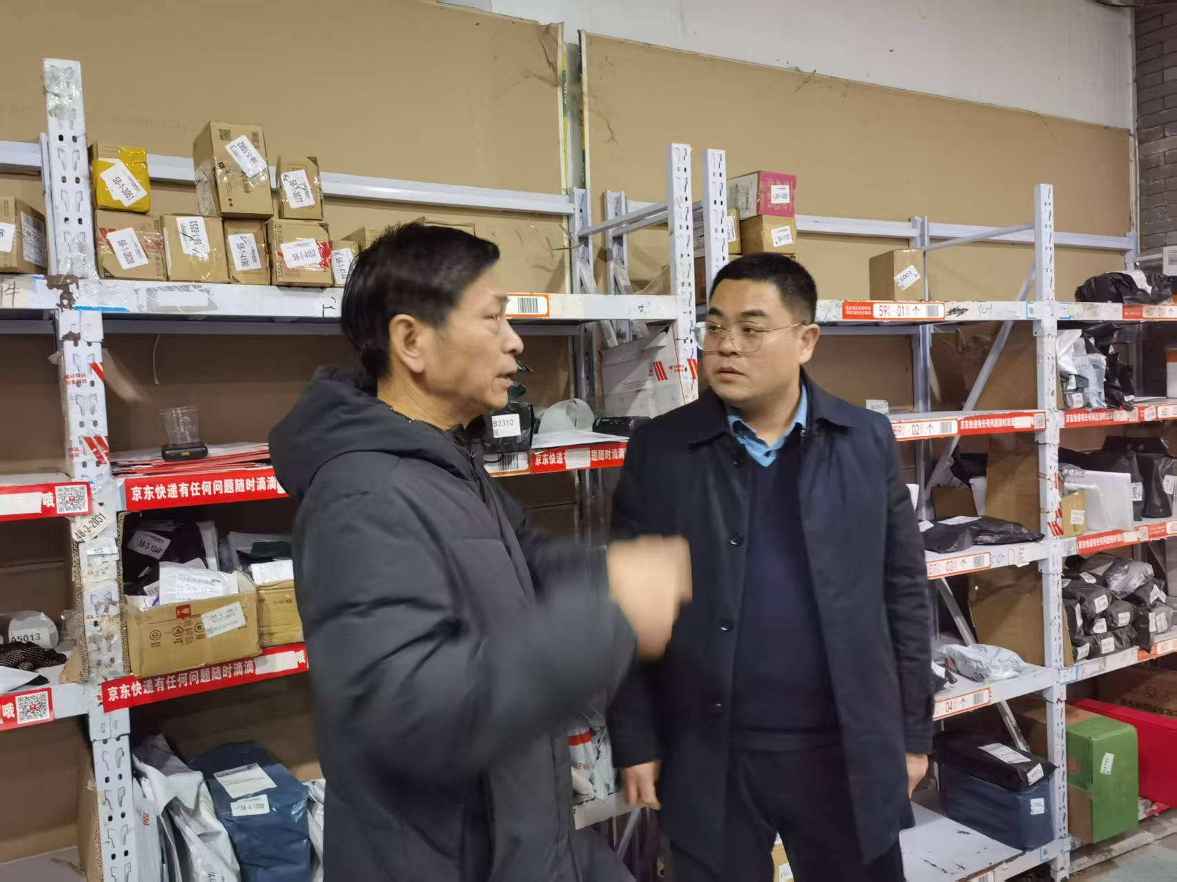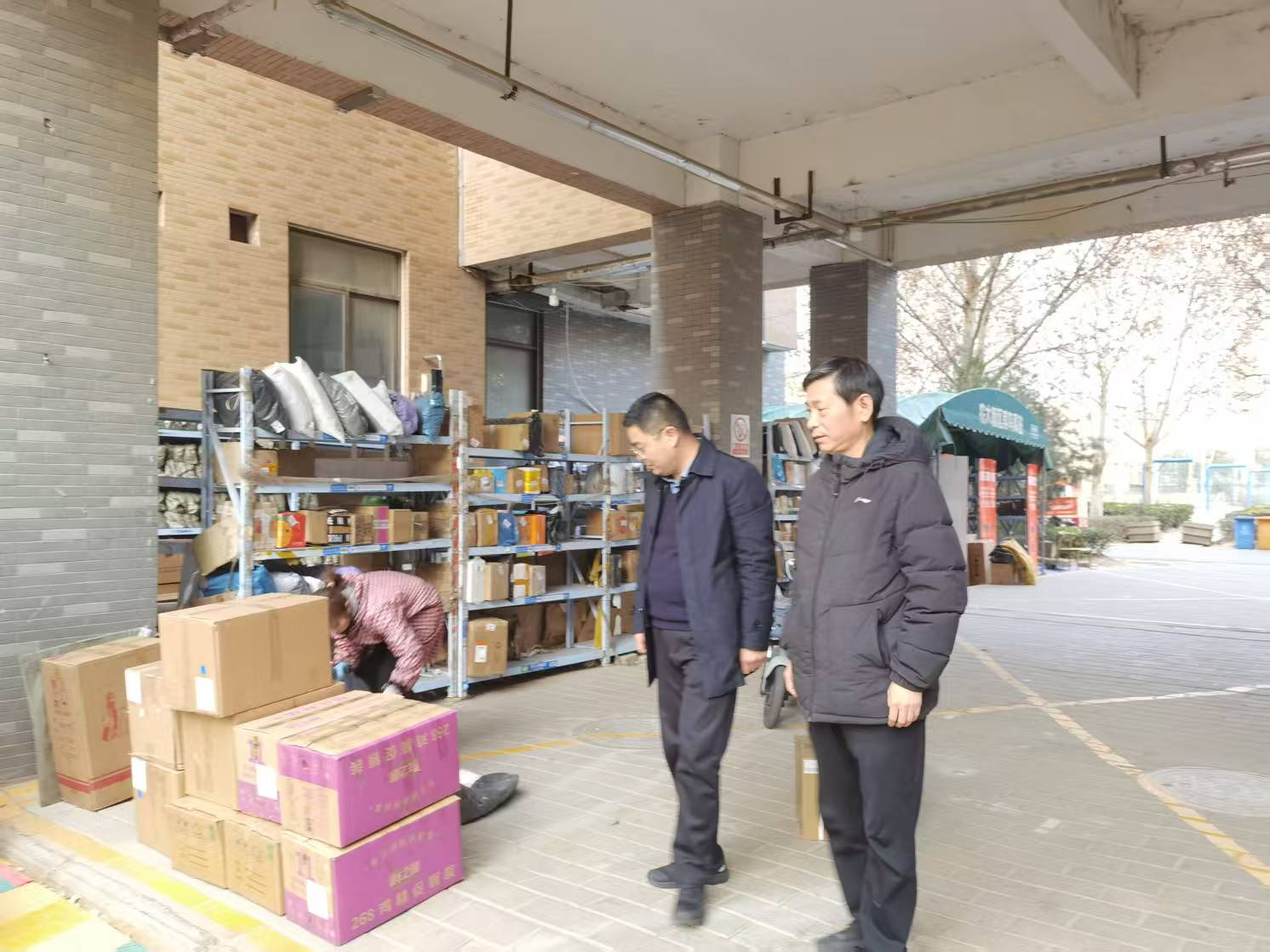 党委副书记杨鑫和副院长张卫东查看菜鸟驿站的安全情况