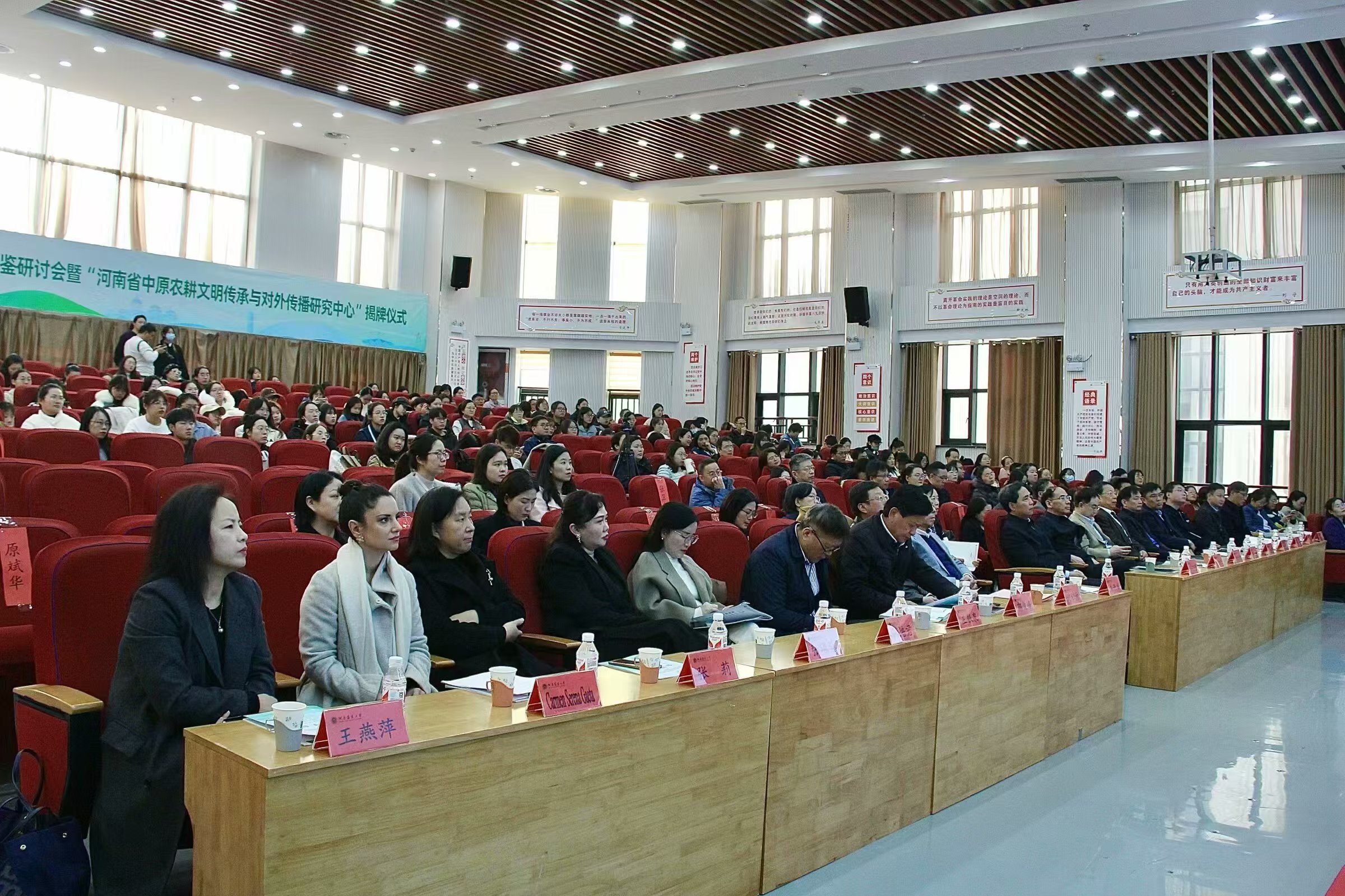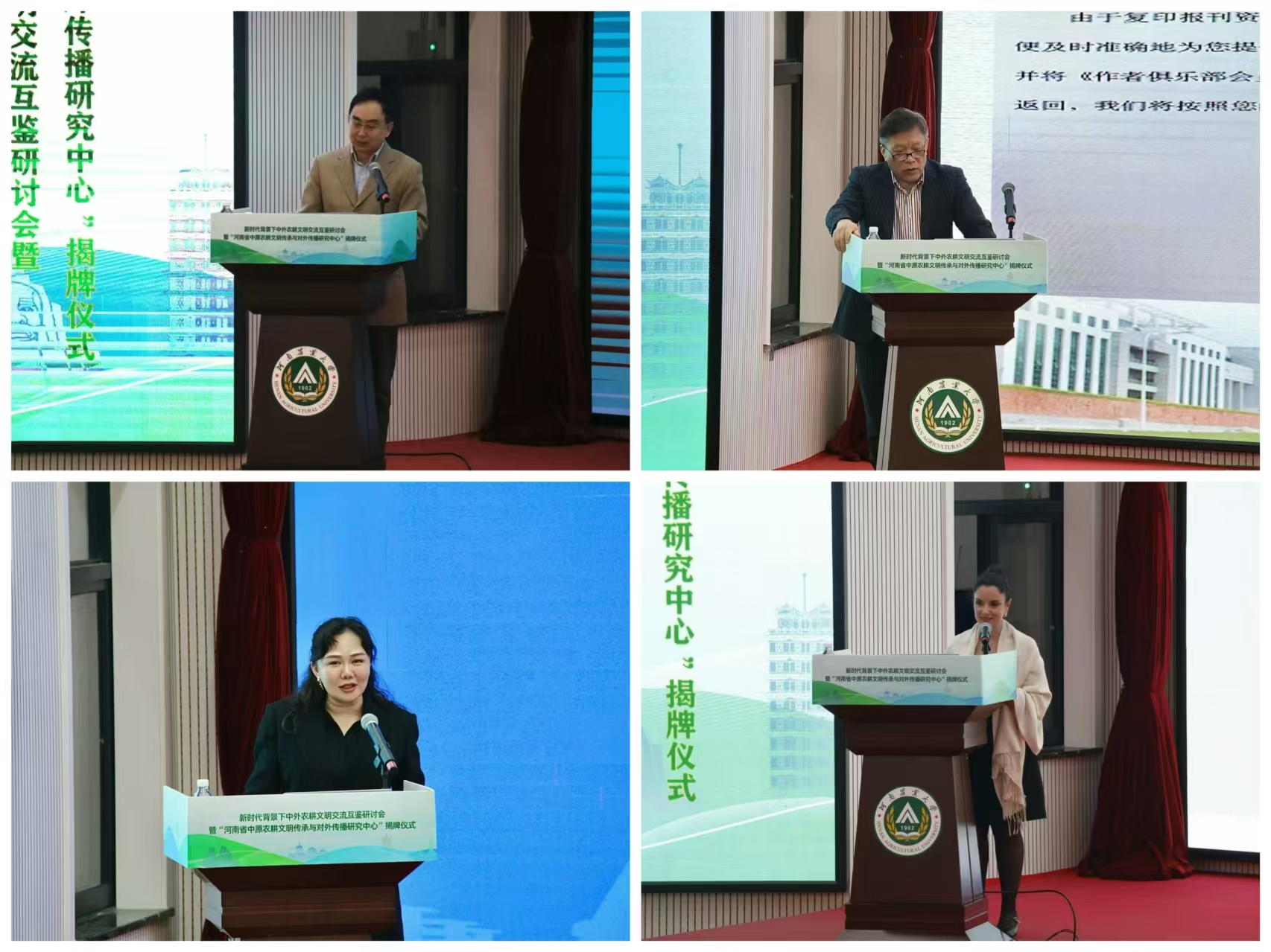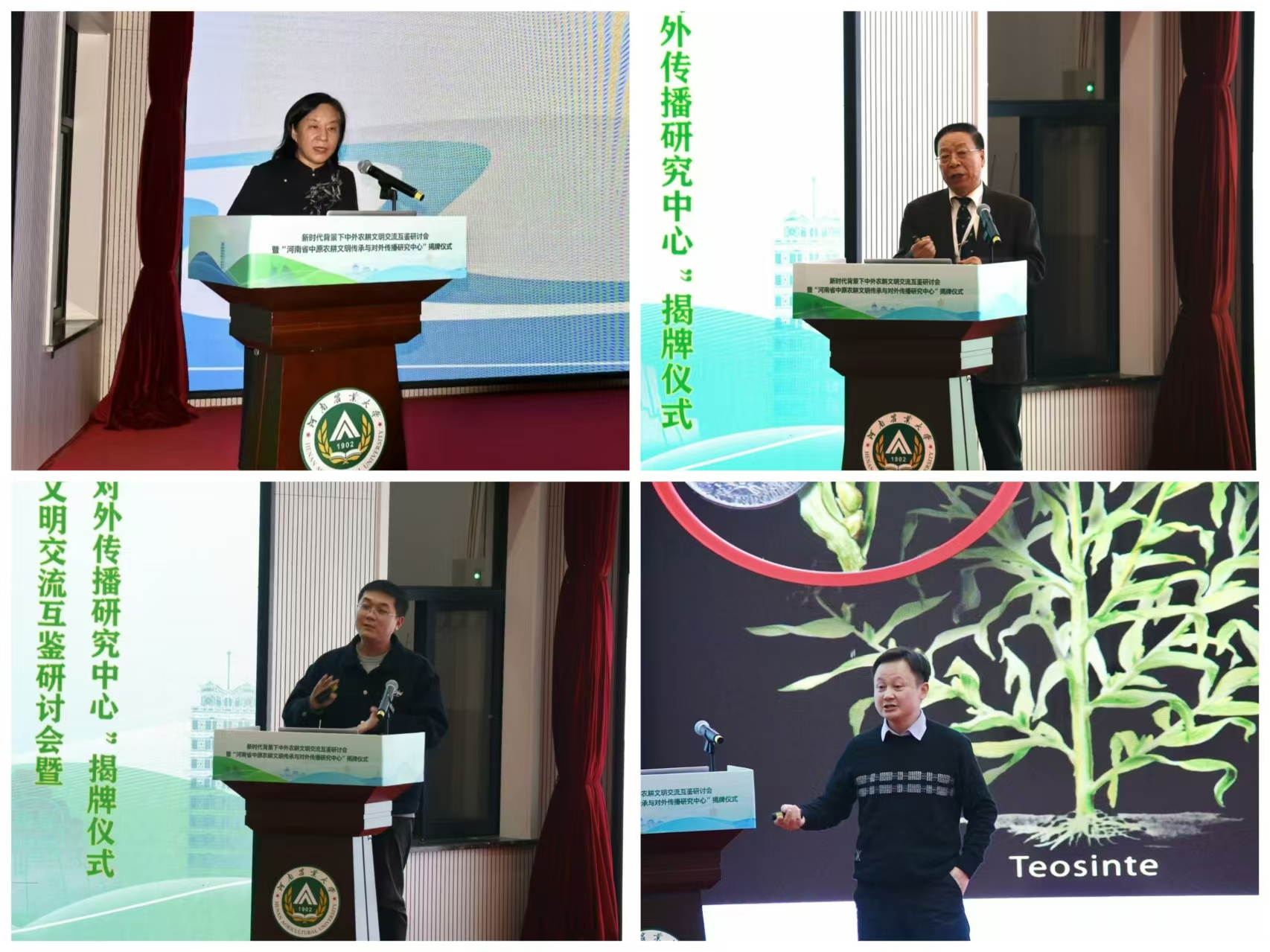 开幕式上,河南省农业农村厅党组成员一级巡视员马万里,中共河南省委外事办二级巡视员焦开举,河南省高等教育学会外语教学研究分会会长、河南中医药大学党委副书记张加民,河南农业大学党委副书记、工会主席何松林,河南省翻译协会会长郭俊峰,中共河南省委外事办原副主任、一级巡视员杨玮斌共同为河南省中原农耕文明传承与对外传播研究中心揭牌。