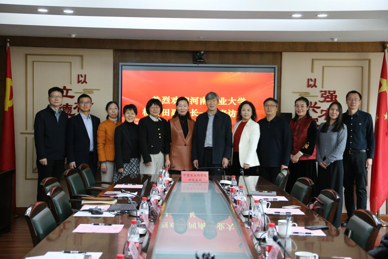 本网讯(通讯员: 吴玲 魏少敏)11月25日,副校长杨喜田带队到中国农业科学院研究生院针对中国现代农业联合研究生院的外语教学进行专项调研交流。中国农业科学院研究生院党委书记姜梅林、副院长、纪委书记李哲敏、院长助理、教学督导处处长温洋、教务处副处长(主持工作)卓炯、教务处副处长白雪、继续教育处处长(挂职)李强、院长办公室副主任(挂职)王亮、外语教研室主任卢鹿及全体教师等出席座谈会。我校外国语学院负责人及研究生英语教学部主任参加学习交流。