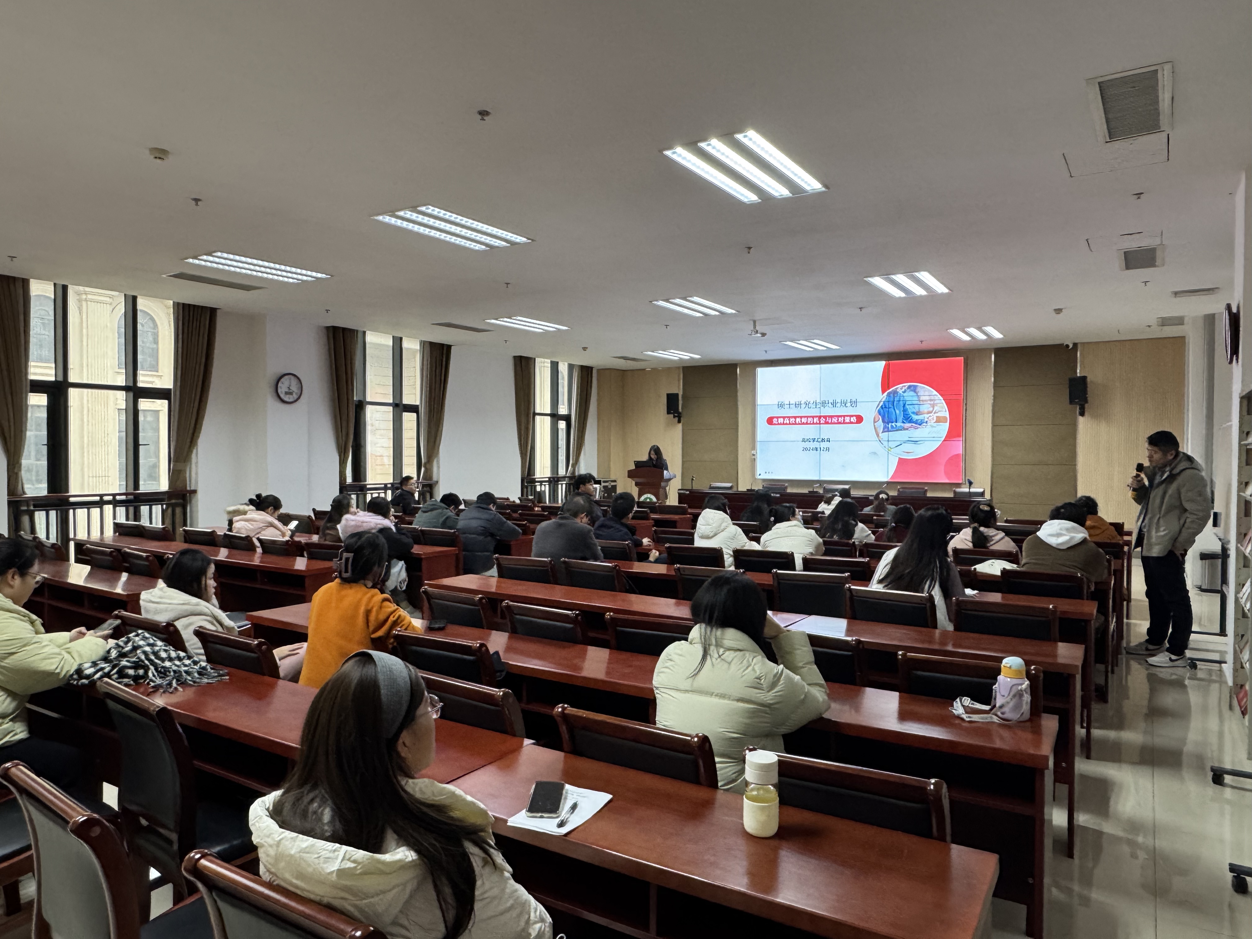 本网讯(审稿:杨鑫 供稿:薛杰)为进一步提升我校研究生职业规划能力和就业竞争力,助力研究生实现高质量就业,12月9日下午,由我校招生就业办公室主办,外国语学院承办的硕士研究生职业规划——“竞聘高校教师的机会与应对策略”宣讲会在龙子湖校区教学楼A324教室成功举办。此次宣讲会邀请到河南省学汇教育科技公司负责人及宣讲人出席,学校近百名硕士研究生参加。
