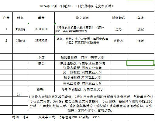 本网讯(审稿:吴玲 供稿:马孝幸)12月12日,我院组织开展了2024届下半年翻译硕士学位论文答辩工作。本次答辩会特邀河南中医药大学张加民教授担任答辩委员会主席,河南牧业经济学院陈延潼教授和我院部分硕士生导师担任答辩委员,2024届下半年2名硕士研究生参加本次答辩。