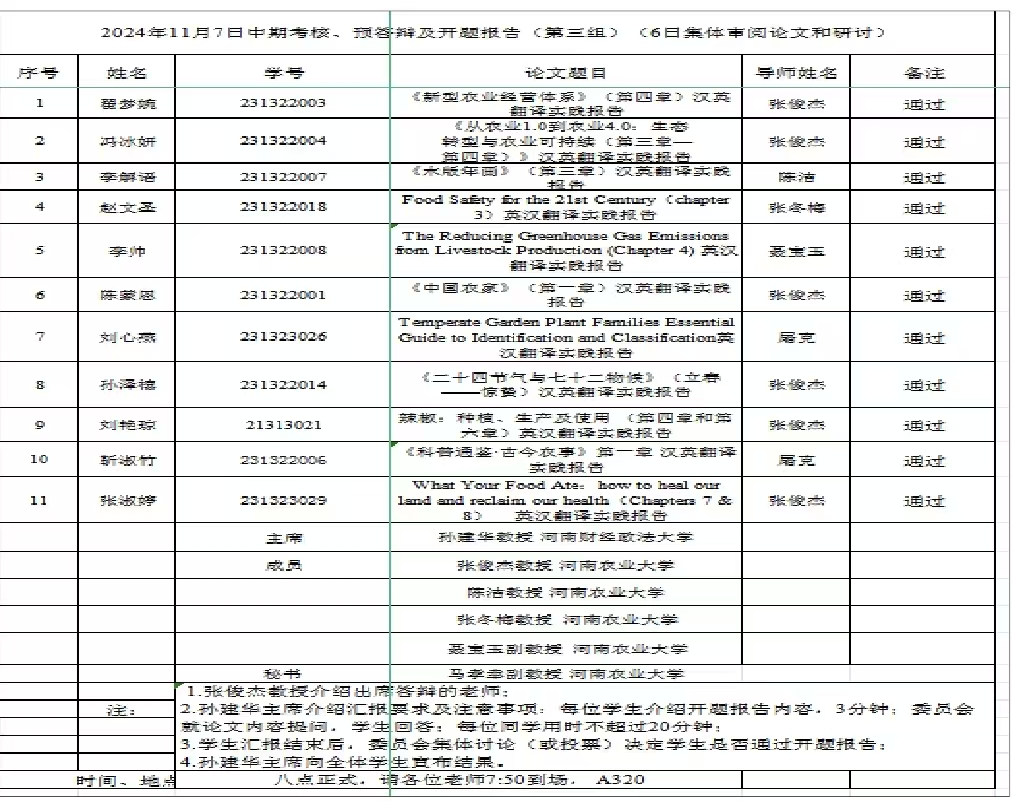 本网讯(审稿:吴 玲 ;供稿:马孝幸;摄影:马孝幸 齐晓萌 王静岩)11月6-7日,我院组织开展了2024年英语笔译专业研究生学位论文开题报告及预答辩、中期考核论证会。本次论证会特邀河南师范大学赵文静教授、河南财经政法大学孙建华教授和郑州航空工业管理学院郭银玲教授分别担任论证小组主席,我院硕士生导师担任委员,2名研究生参加预答辩、中期考核和29名23级研究生参加开题答辩;24级研究生旁听了此次论证会。