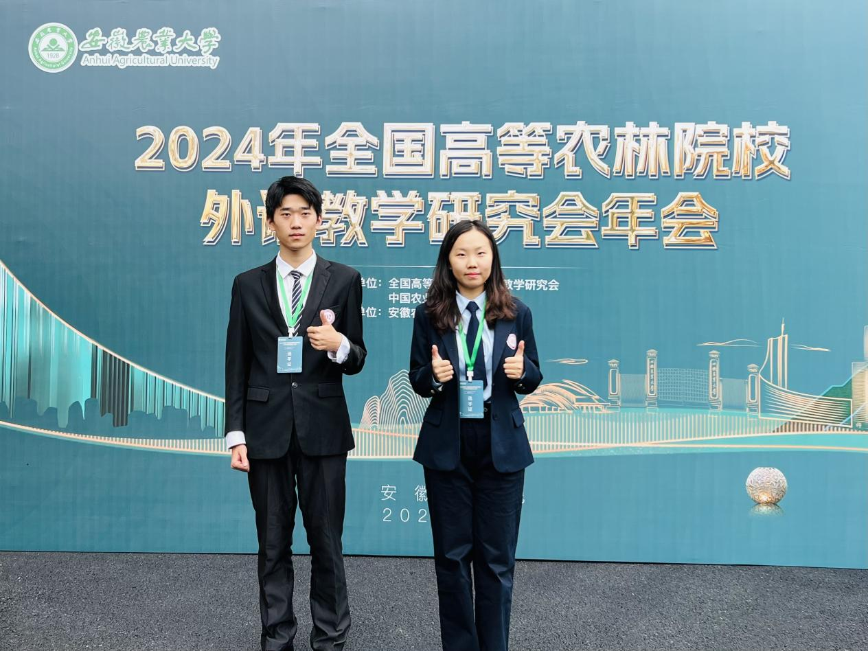 本网讯(审稿:吴 玲 供稿:豆 涛)11月8日至10日,由中国农业出版社、全国高等农林院校外语教学研究会联合主办、安徽农业大学承办的2024年全国高等农林院校外语教学研究会年会暨第三届全国高等农林院校大学生英语演讲大赛在安徽合肥成功举办,外国语学院院长张俊杰带队参加。外国语学院2024级翻译专业张艺翔和林学院2022级经济林专业马驰骋代表我校参赛并在比赛中发挥出色,分别获得二等奖和优秀奖,豆涛和周亚楠两位老师获优秀指导教师奖。