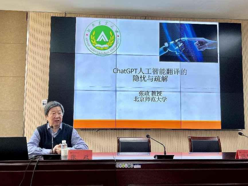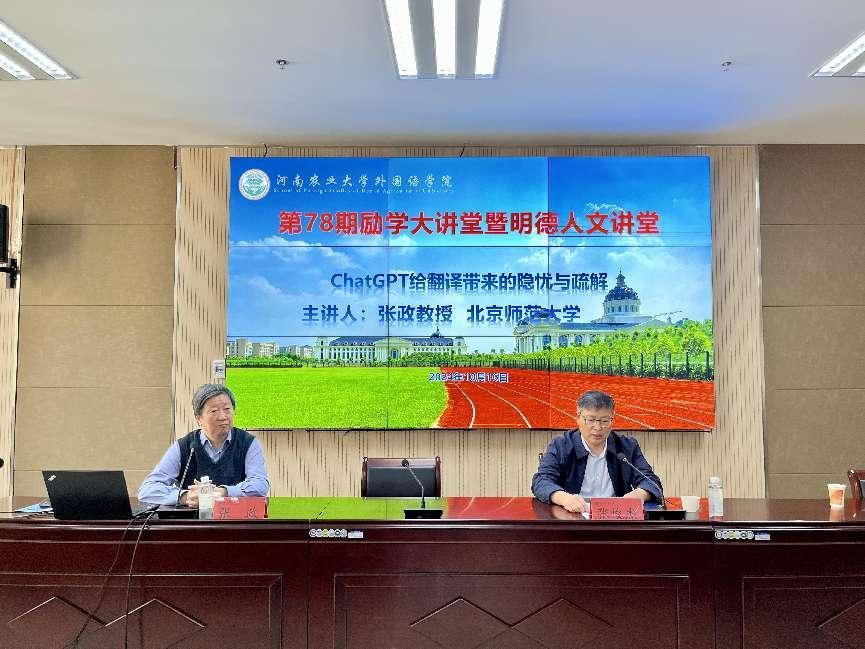 本网讯(审稿:吴 玲;供稿:马孝幸)10月16日上午北京师范大学张政教授、博士生导师应邀做客我院第78期励学大讲堂暨明德人文讲堂,做了题为“ChatGPT给翻译带来的隐忧与疏解”的报告会。报告会由院长张俊杰教授主持,我院师生参加了此次报告会。