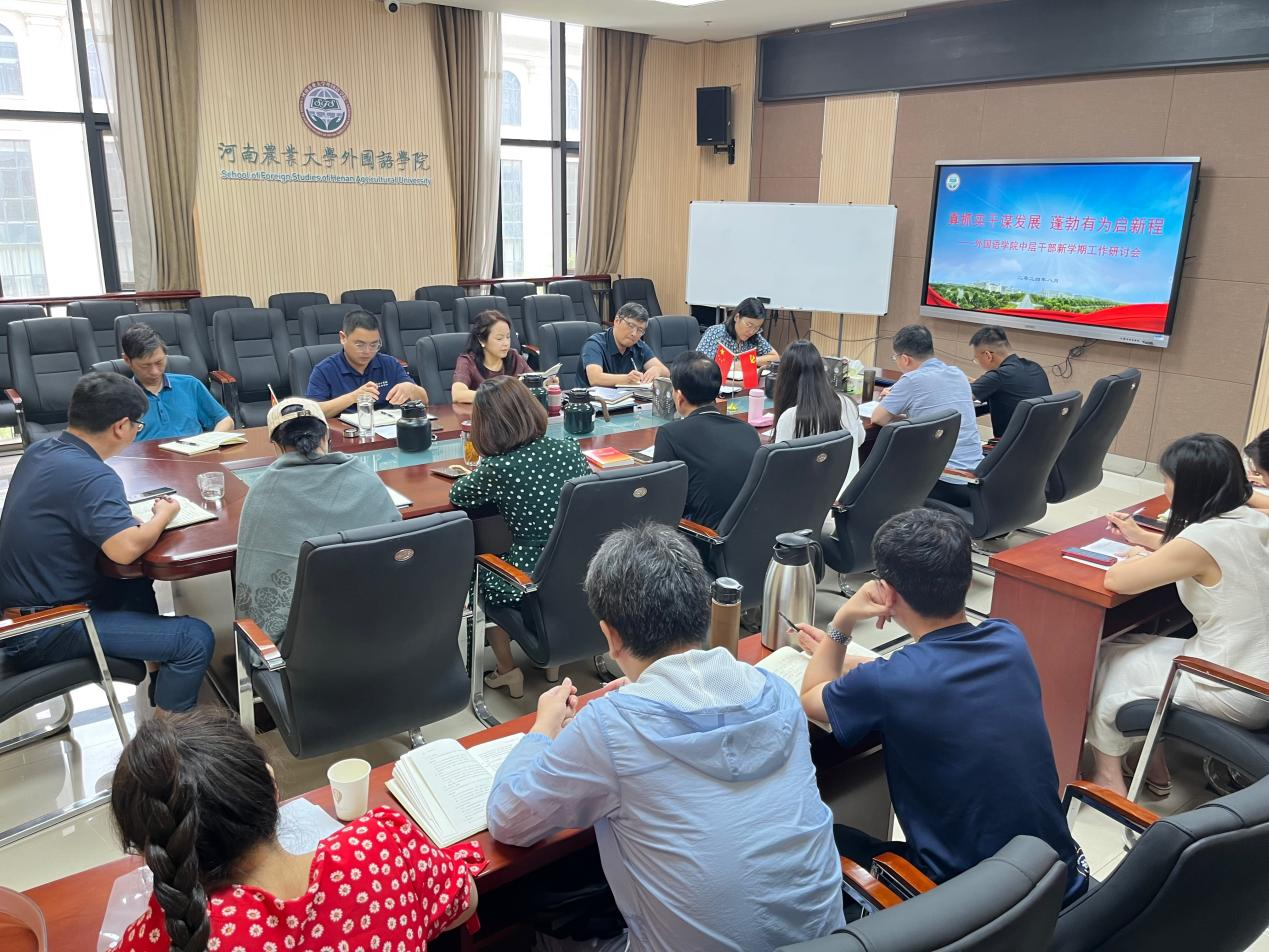 本网讯(审稿:杨鑫 供稿:郝晓峰 薛杰 摄影:黄彪)8月26日上午,外国语学院召开了新学期中层干部研讨会。会议以“真抓实干谋发展,蓬勃有为启征程”为主题,由院党委副书记杨鑫主持。学院领导班子全体成员和中层干部参加了会议。