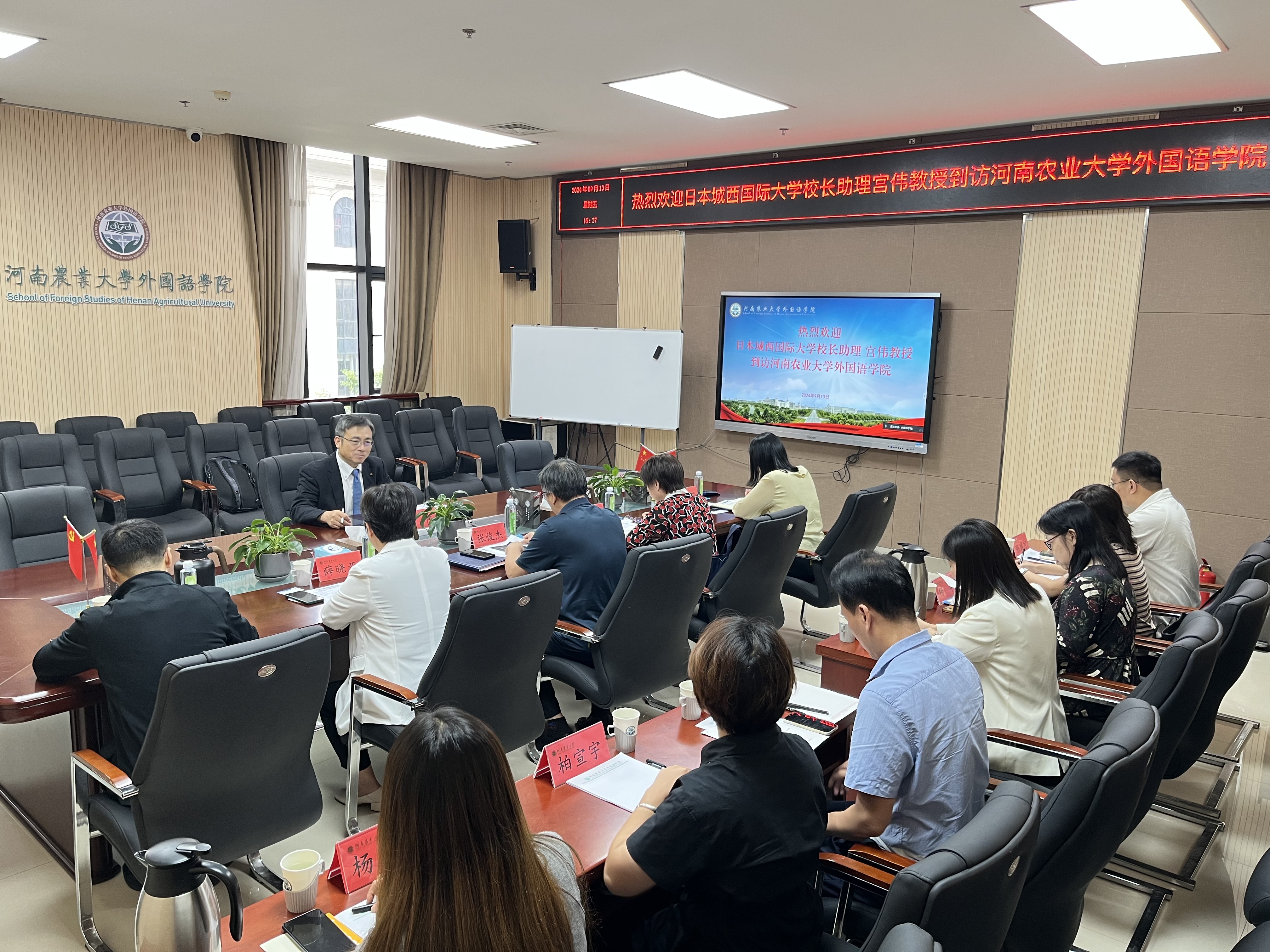 本网讯(审稿:吴玲 供稿:余亮 摄影:黄彪)9月13日下午,日本城西国际大学校长助理宫伟教授来我院座谈。河南农业大学教务处副处长薛晓亚、国际交流合作处副处长曾效葵、国际教育学院副院长邢林鸿、外国语学院院长张俊杰、副院长吴玲,以及日语系负责人和教师代表参加了此次会谈。会议由张俊杰主持。
