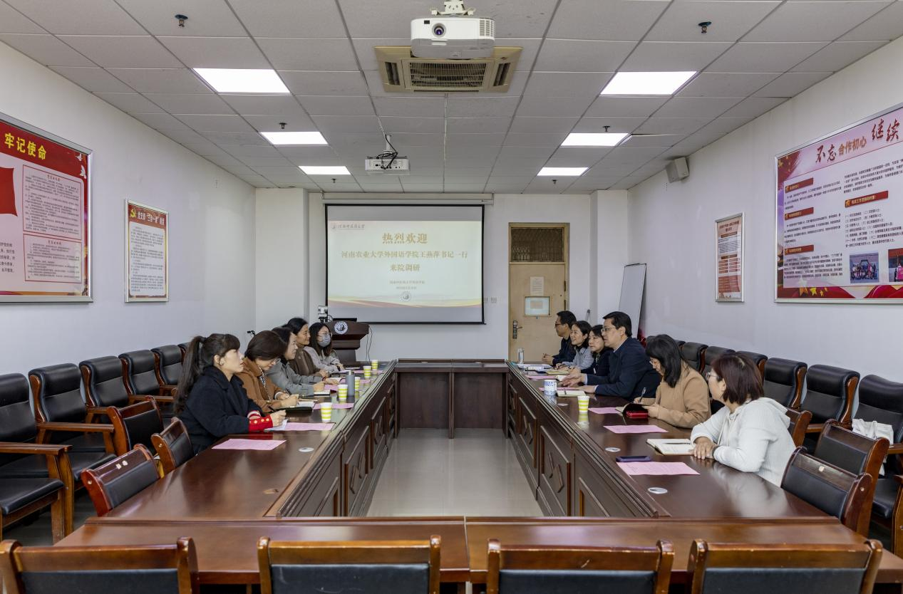 本网讯(审稿:王燕萍 供稿:郝晓峰 田馥梦)为推动学习贯彻习近平新时代中国特色社会主义思想主题教育走深走实,学习全国党建工作样板党支部的先进经验,进一步提升学院样板党支部创建工作质量,3月19日上午,外国语学院党委书记王燕萍带队赴河南中医药大学外语学院调研交流,党政办公室主任、校级样板党支部支部委员、“双带头人”代表随同调研。河南中医药大学外语学院党委书记庞亚宾、副院长朱文晓、全国样板党支部书记及相关教师代表参加了座谈,会议由庞亚宾主持。