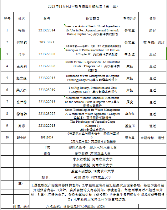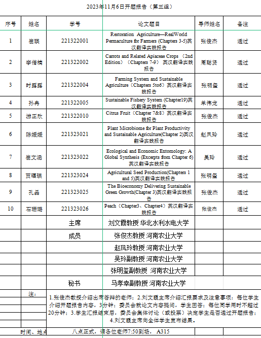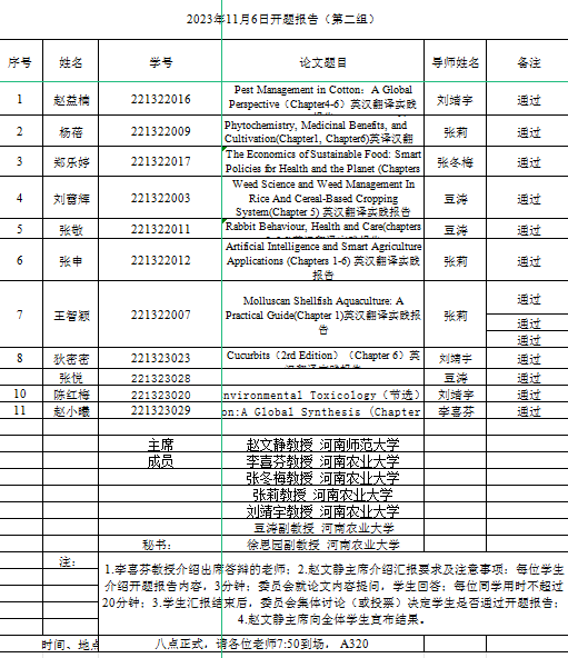 本网讯(审稿:张俊杰 供稿:陈昱)2023年11月5日至6日,外国语学院在繁塔楼A315、A320和A324教室顺利举行2022级英语笔译研究生毕业论文开题报告会。此次开题报告会特邀河南师范大学赵文静教授、华北水利水电大学刘文霞教授与李胜机教授担任委员会主席,全体硕士生导师担任委员。共有31名研究生参与本次毕业论文开题报告会,分为三个小组展开答辩。2023级研究生观摩旁听。