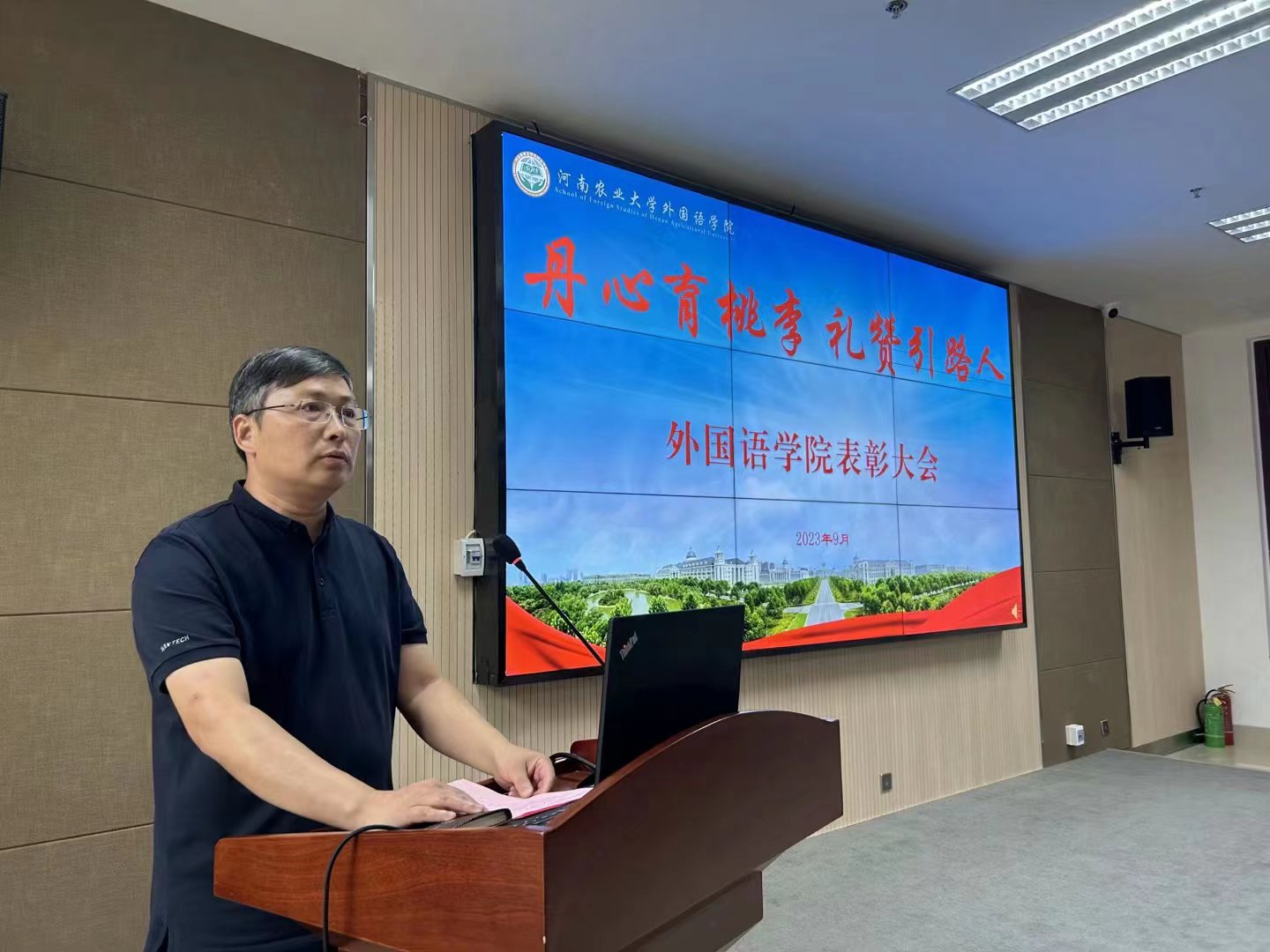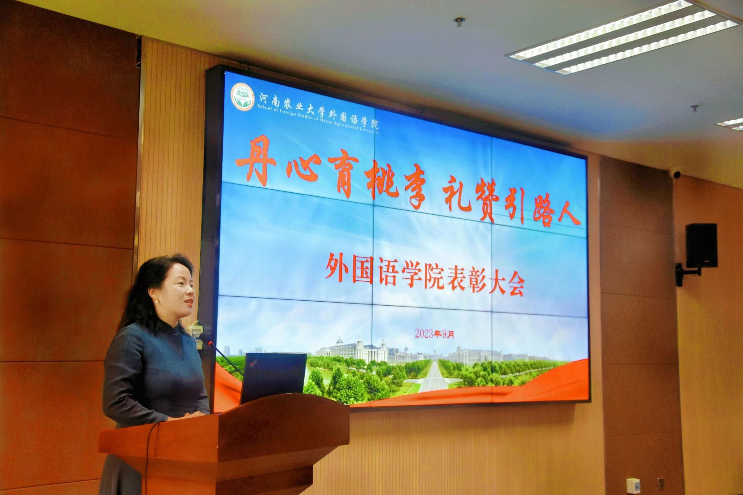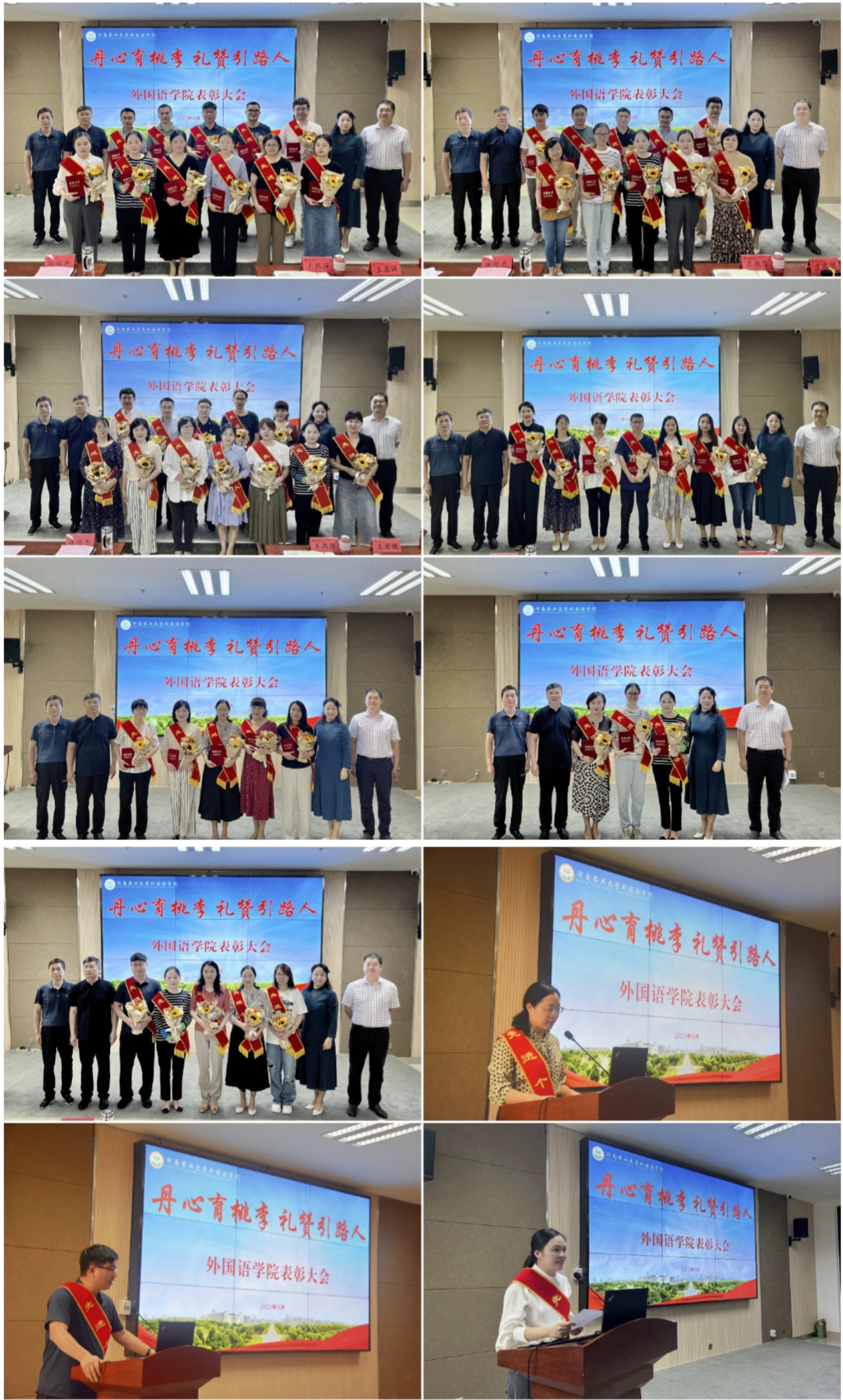 院长张俊杰宣读了获得“出彩河南人”2023年最美教师、河南省文明教师、河南省教学技能大赛一等奖、“翻译河南工程”优秀成果奖,校巾帼标兵、优秀教师、优秀班主任、十佳辅导员等省级、校级荣誉教师名单。副院长张卫东宣读了外国语学院《关于表彰优秀共产党员、优秀党务工作者、先进基层党组织的决定》《关于表彰2022-2023年度最美班主任的决定》《关于表彰2022-2023年度“师德标兵”的决定》《关于表彰WTT新乡冠军赛现场翻译、河南省外国文学与比较文学学会2023年年会和“翻译河南工程”先进工作者的决定》。在欢快的音乐声和热烈的掌声中,院领导为获得代表颁发奖状。