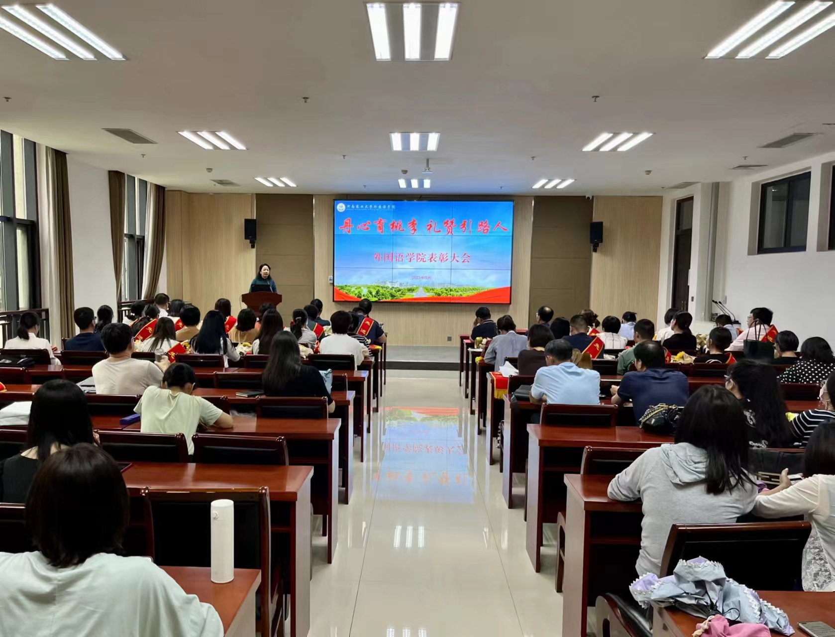 本网讯(审稿:王启佩 供稿:冯超)9月12日下午,外国语学院召开以“丹心育桃李,礼赞引路人”为主题的教师表彰大会。院党委书记王燕萍、院长张俊杰携领导班子成员出席会议,会议由院党委副书记王启佩主持。