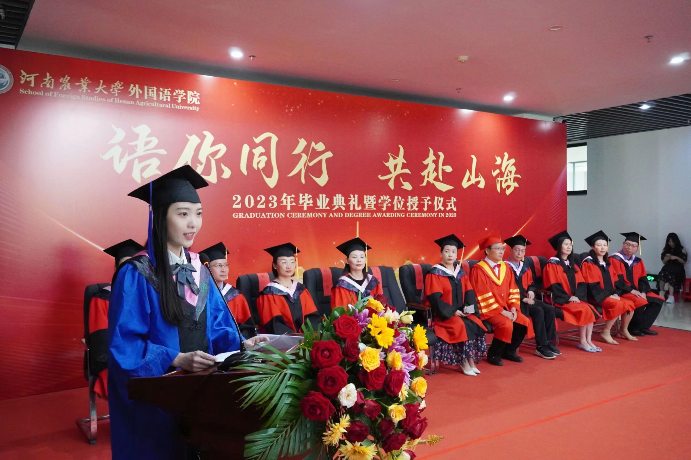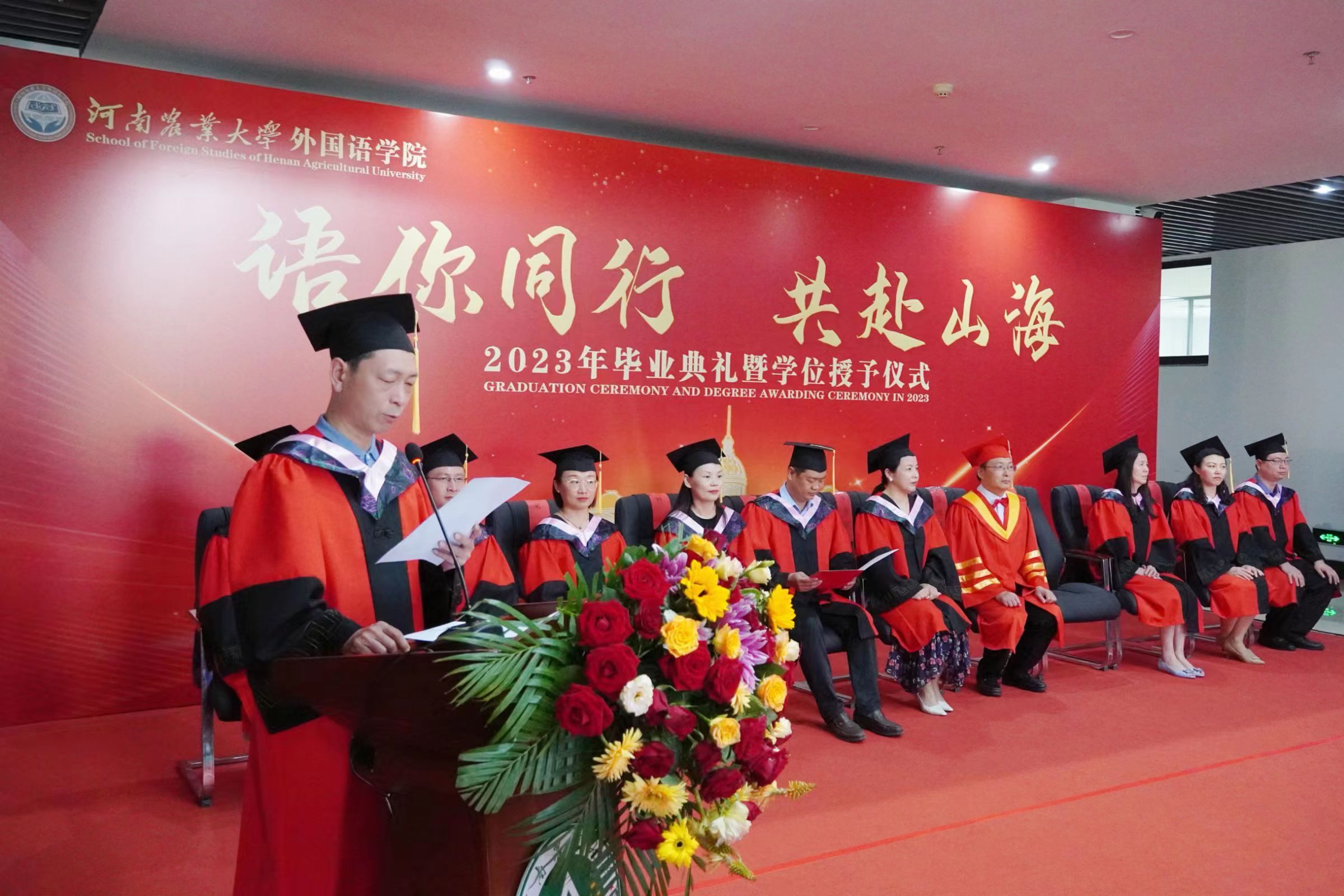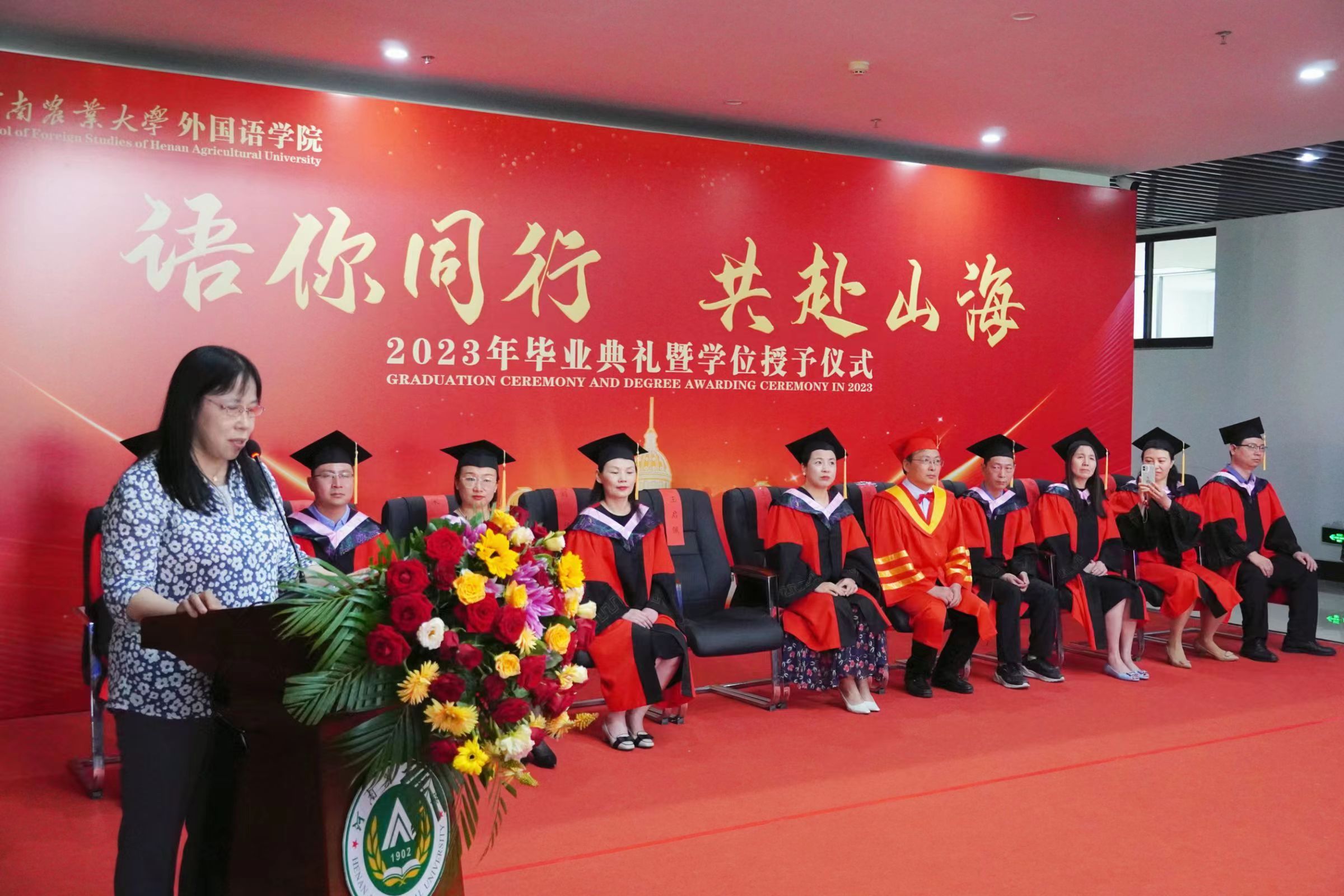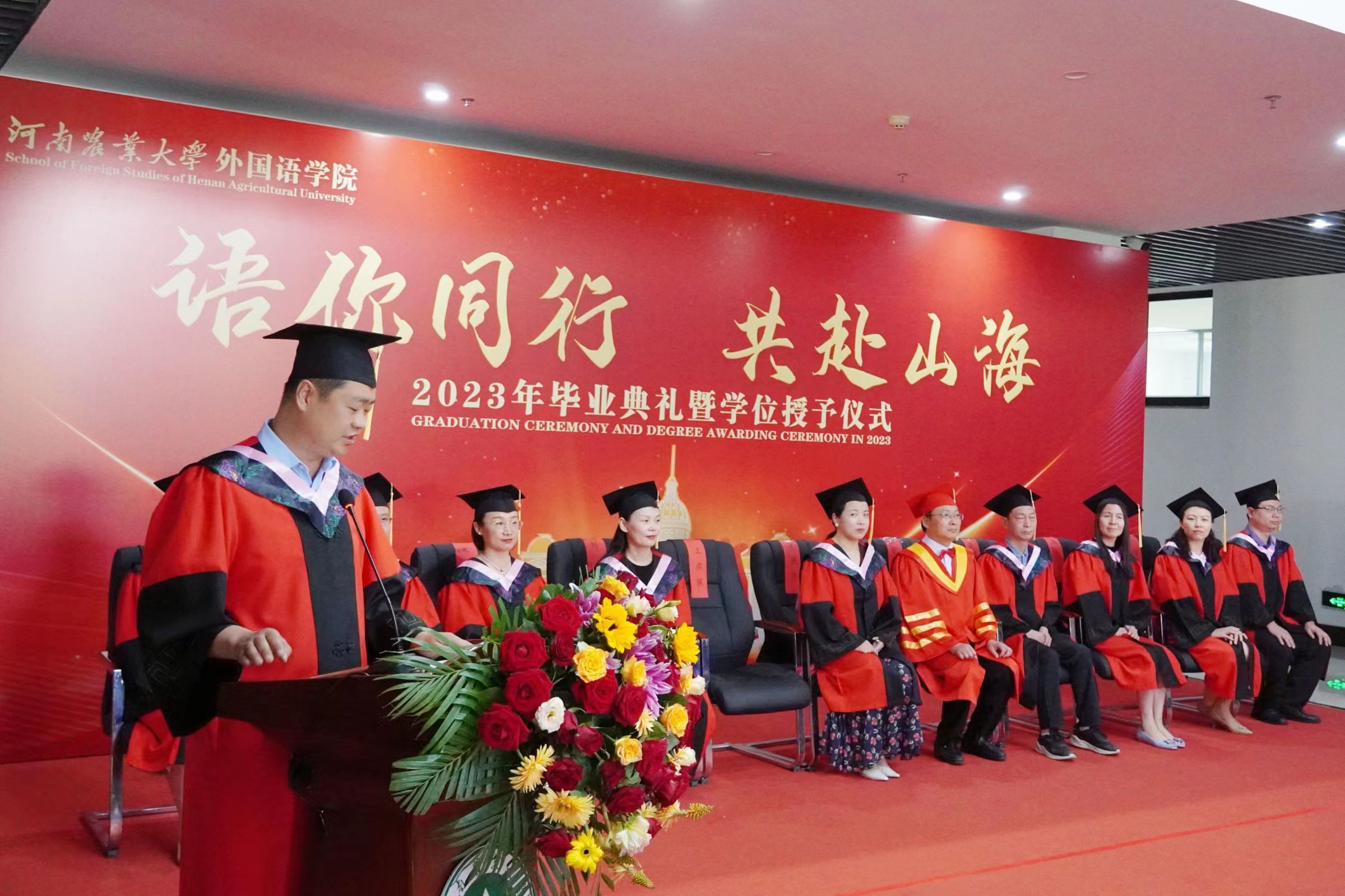 本网讯(审稿:王启佩 供稿:冯超 许菲)语你同行赴山海,不负青春向未来。6月13日上午,河南农业大学外国语学院2023年毕业典礼暨学位授予仪式在龙子湖校区繁塔楼A座隆重举行。323名2023届毕业生顺利完成毕业,即将奔向远方,扬帆起航。院党委书记王燕萍、院长张俊杰携院领导班子成员及院学位评定委员会委员身着学位服出席仪式。