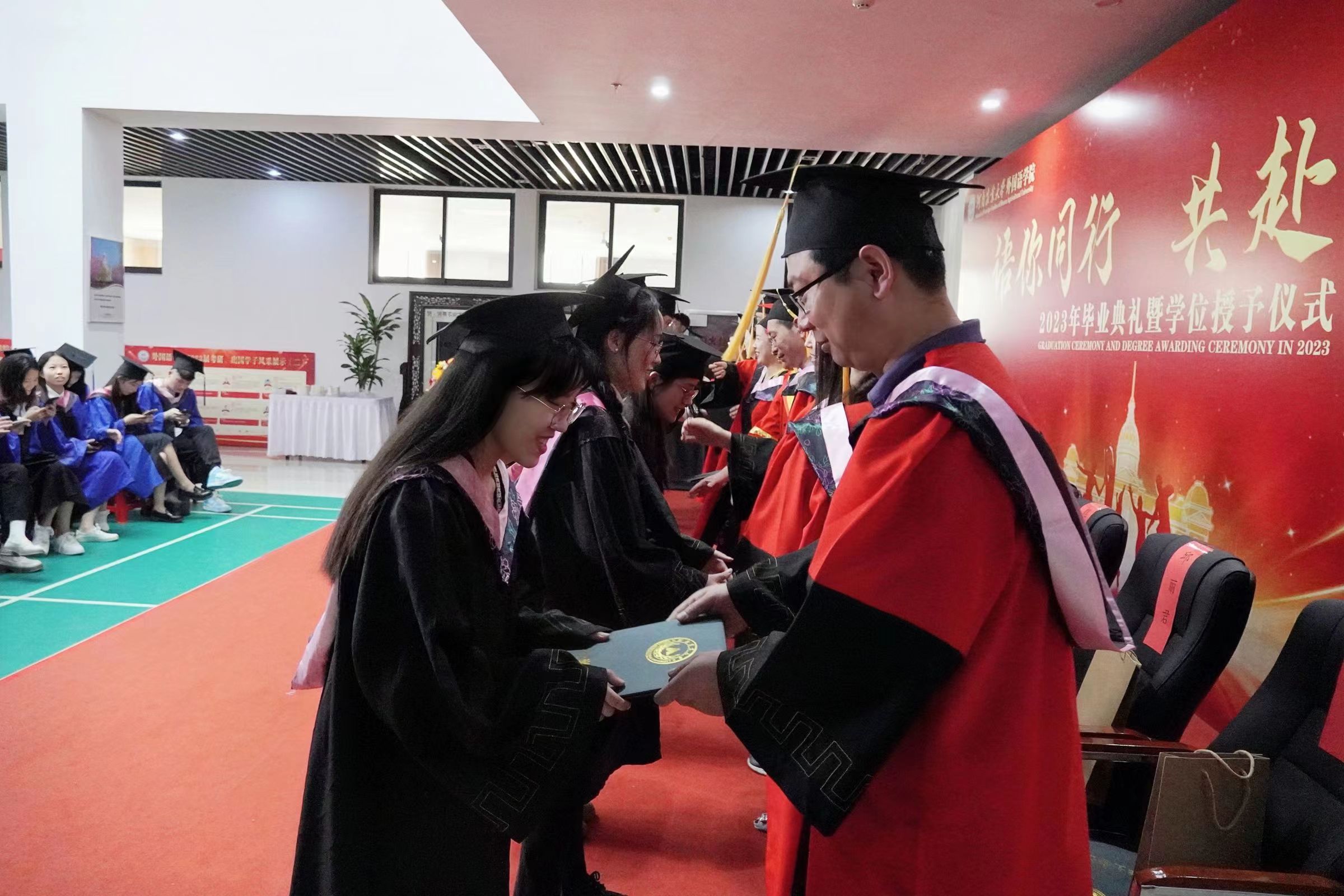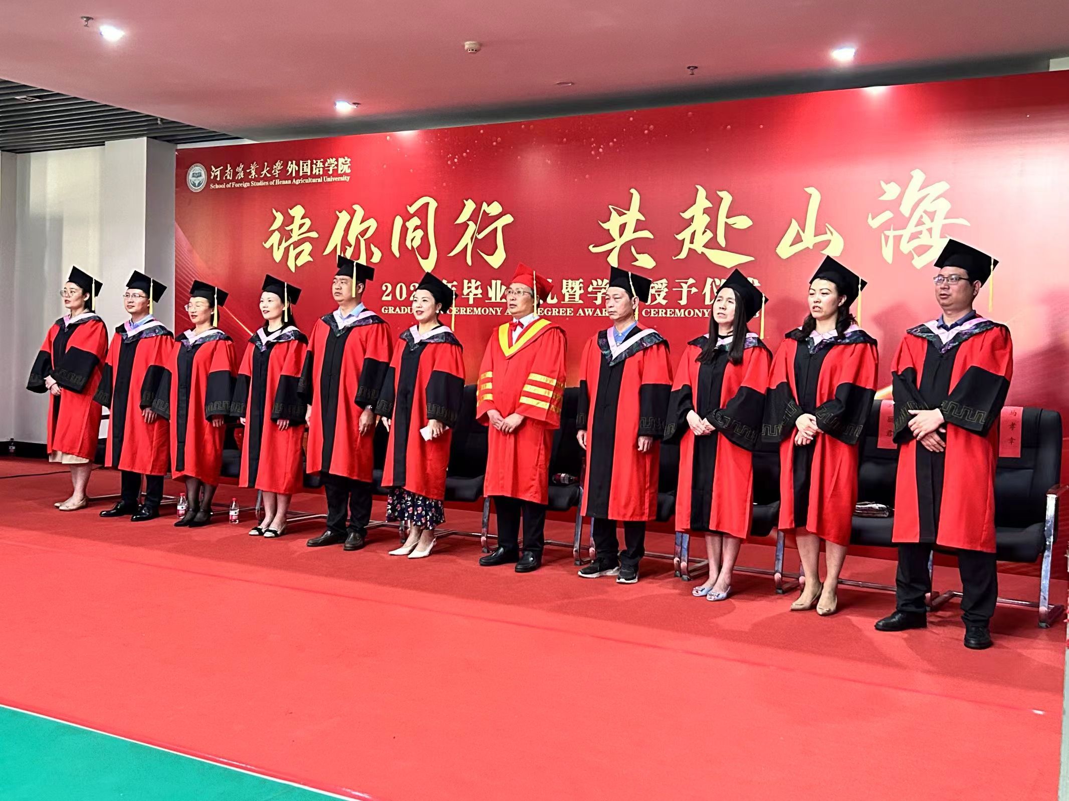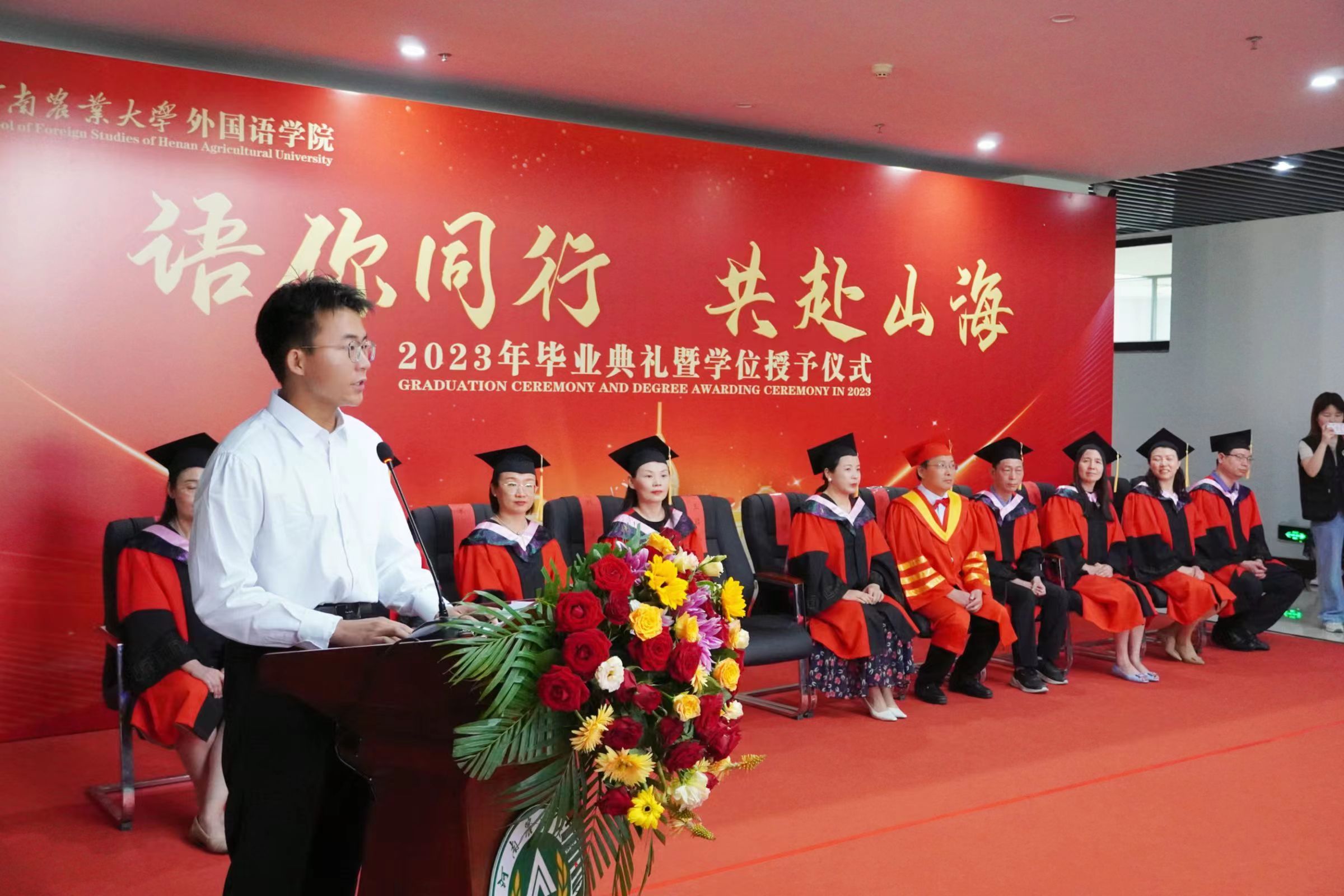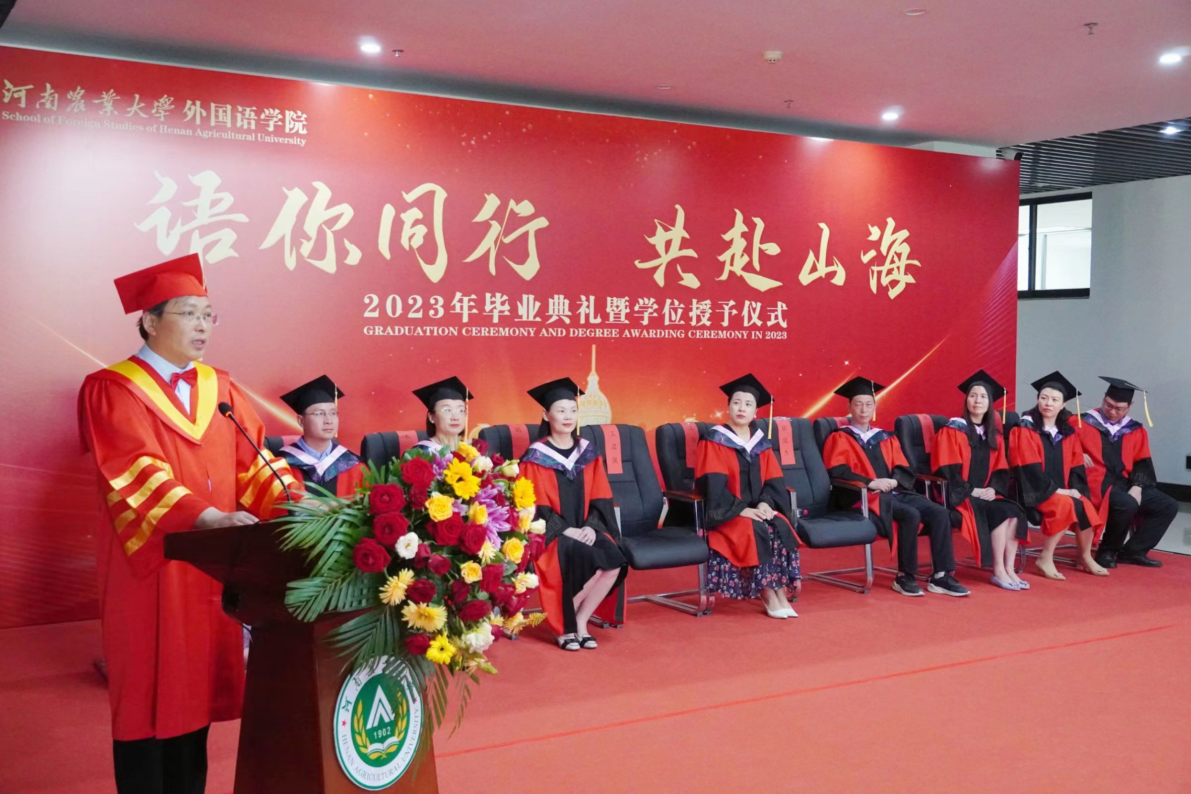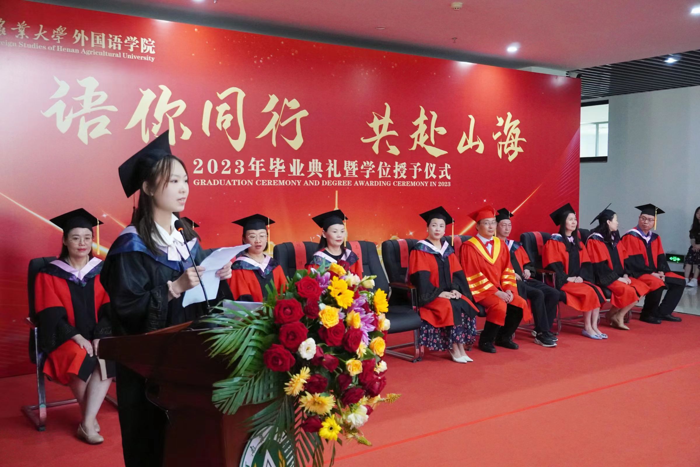 本网讯(审稿:王启佩 供稿:冯超 许菲)语你同行赴山海,不负青春向未来。6月13日上午,河南农业大学外国语学院2023年毕业典礼暨学位授予仪式在龙子湖校区繁塔楼A座隆重举行。323名2023届毕业生顺利完成毕业,即将奔向远方,扬帆起航。院党委书记王燕萍、院长张俊杰携院领导班子成员及院学位评定委员会委员身着学位服出席仪式。