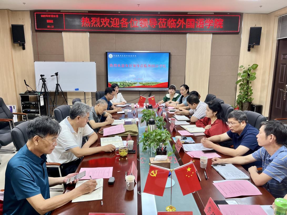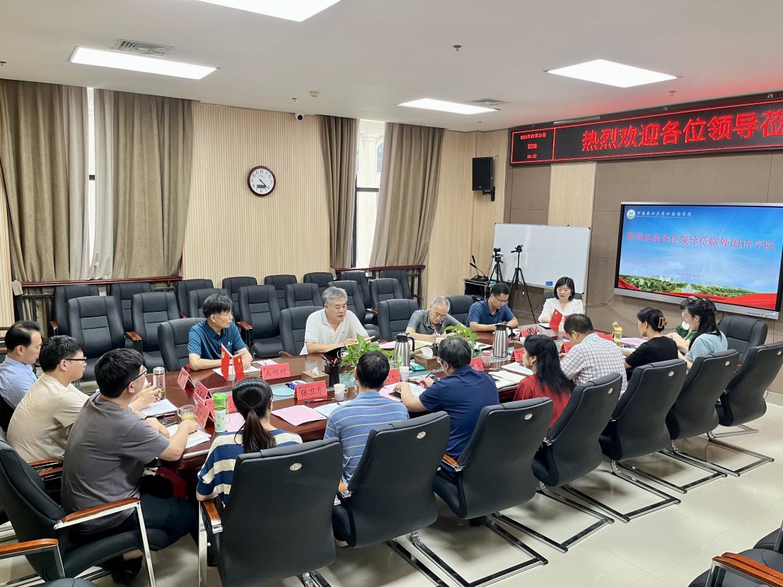 院长张俊杰介绍了学院概况,对学院乡村振兴工作开展情况及取得成效,从外语翻译、科学研究、社会调研与合作共建及青年学生社会实践等四个方面进行了汇报。
