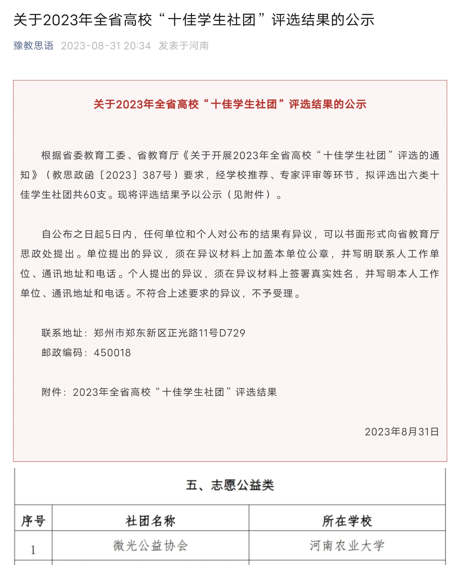 本网讯(审稿:王启佩 供稿:冯文妍)为深入学习贯彻习近平新时代中国特色社会主义思想,切实加强学生社团建设管理,充分发挥学生社团育人功能,着力打造一批特色鲜明、运行规范、师生认可的示范性学生社团,省委教育工委、省教育厅开展了2023年全省高校“十佳学生社团”评选活动,我院微光公益协会入选2023年全省志愿公益类“十佳学生社团”。