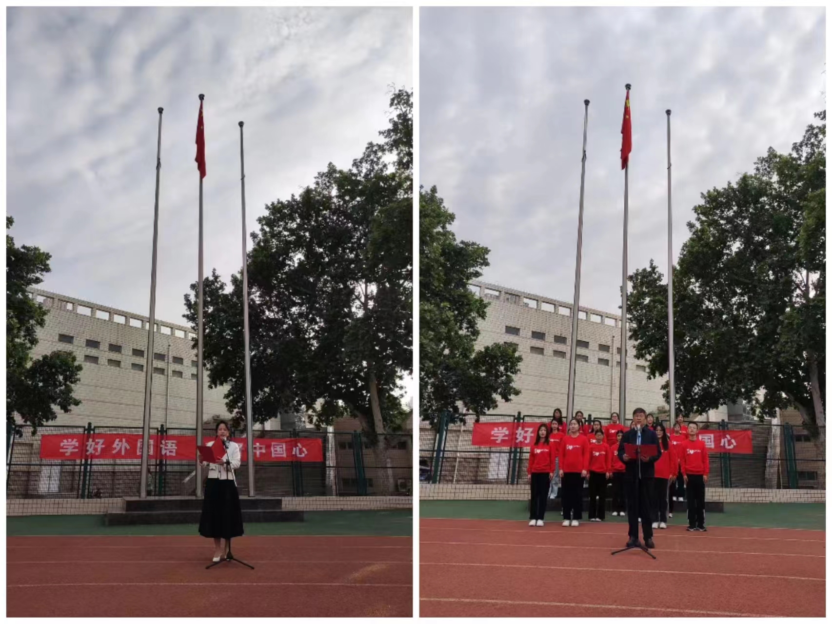 本网讯(审稿:王启佩 供稿:冯超 武宗励)为深入学习宣传贯彻党的二十大精神,深化“三品”主题教育,进一步增强学院广大师生的爱国热情,激扬报国之志,激发奋进力量,外国语学院于5月8日早上七点在文化路校区举行了以“学好外国语,守好中国心”为主题的升国旗仪式。院党委书记王燕萍、院长张俊杰携院学院领导班子成员出席活动,学院教师代表及2022级学生参加此次活动。升旗仪式由院长张俊杰主持。