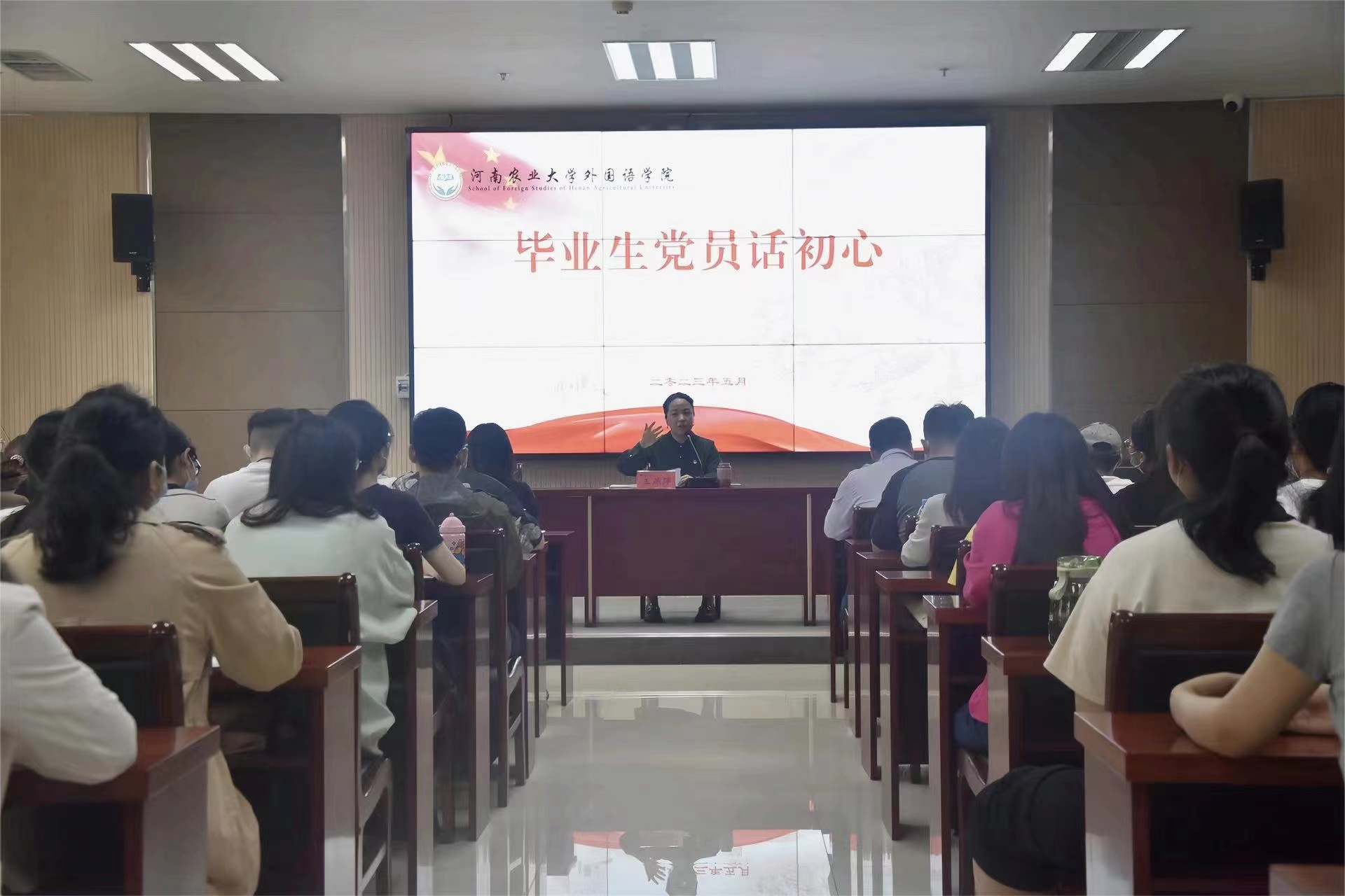 本网讯(审稿:王启佩 供稿:冯超 张仪婷)为全面学习贯彻落实党的二十大精神,持续推进学习贯彻习近平新时代中国特色社会主义思想主题教育走深走实,引导广大毕业生党员增强党性修养,激励全体毕业生党员坚定信念、胸怀祖国、脚踏实地、担当作为。5月30日,学院于龙子湖校区A324会议室开展2023届毕业生党员话初心活动。院党委书记王燕萍出席活动并为毕业生上专题党课,院党委副书记王启佩、院团委书记冯超及全体毕业生党员参加活动。