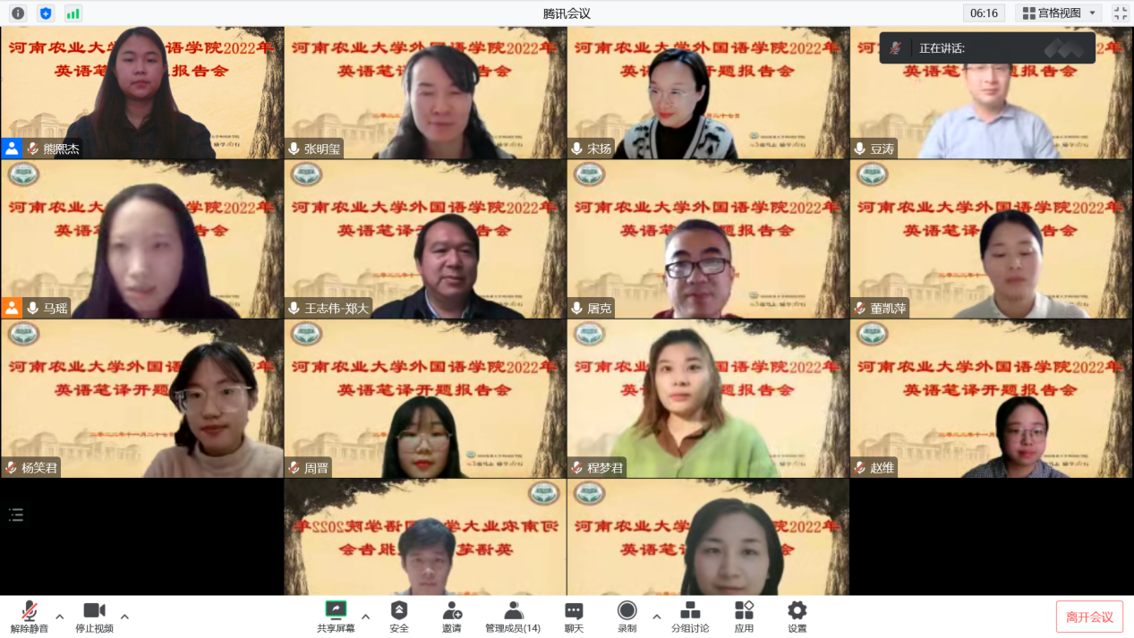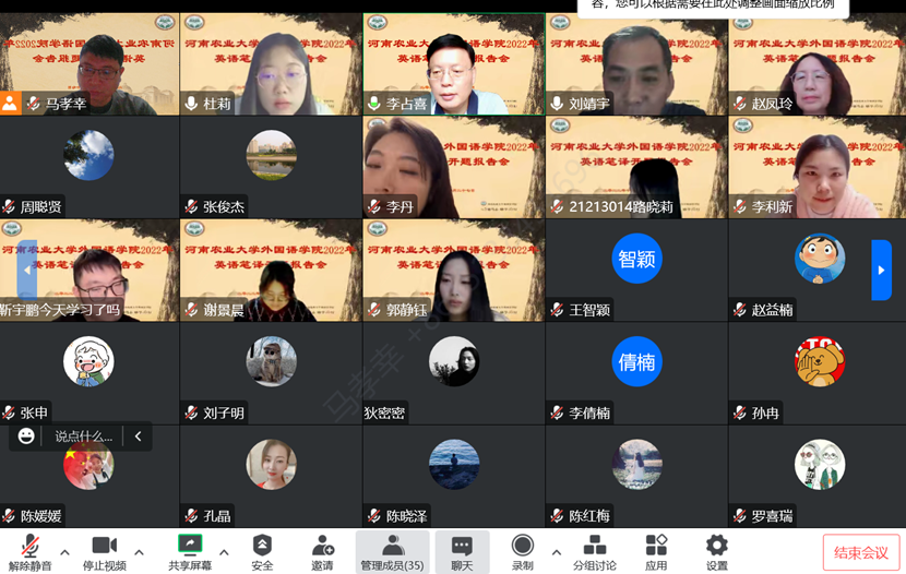 本网讯(审稿:马孝幸 通讯员:李倩楠)11月27日上午,外国语学院2022年翻译硕士开题报告会采用线上的形式顺利举行。此次开题报告会分成三个组别同时进行,华南农业大学李占喜教授、郑州大学王志伟教授、河南师范大学赵文静教授应邀分别担任主席。外国语学院院长张俊杰教授携全体翻译硕士生导师出席会议,25名2021级MTI研究生参与开题报告汇报,2022级MTI研究生旁听会议。