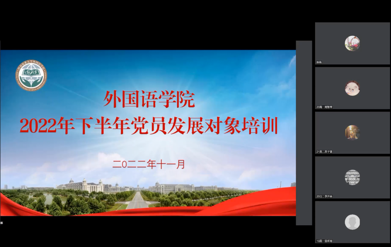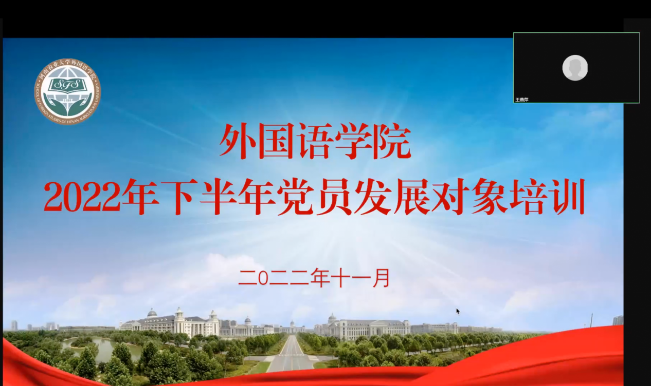 本网讯(审稿:王启佩 供稿:陈桃)为深入学习贯彻落实党的二十大精神,深刻领会二十大报告的丰富内涵和时代价值,进一步增强基层党组织的组织力、凝聚力、战斗力,提高党员发展对象的政治素质和理论水平,把好党员“入口关”,外国语学院举办2022年下半年党员发展对象培训班,院党委书记王燕萍担任主讲嘉宾,全体发展对象参加。