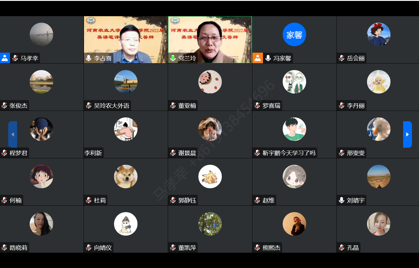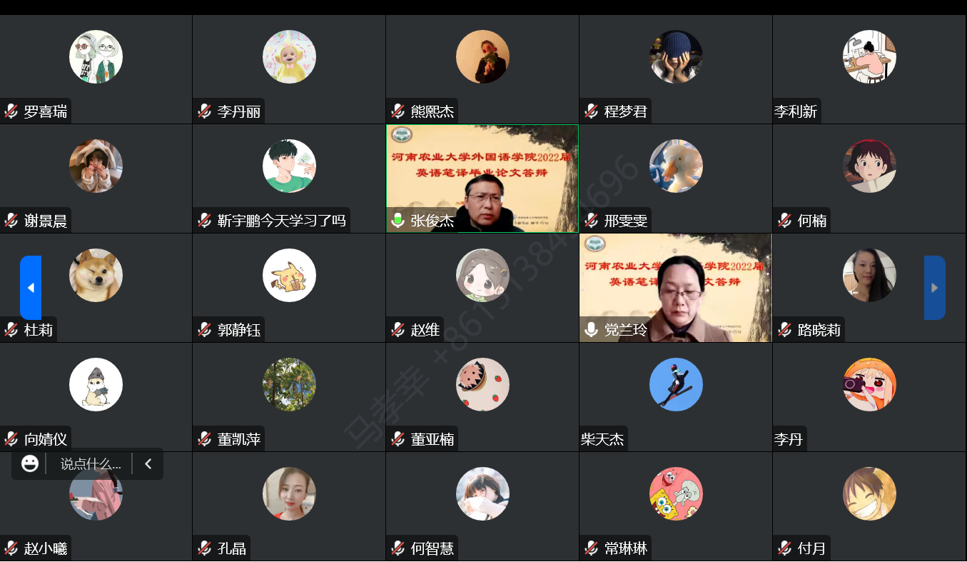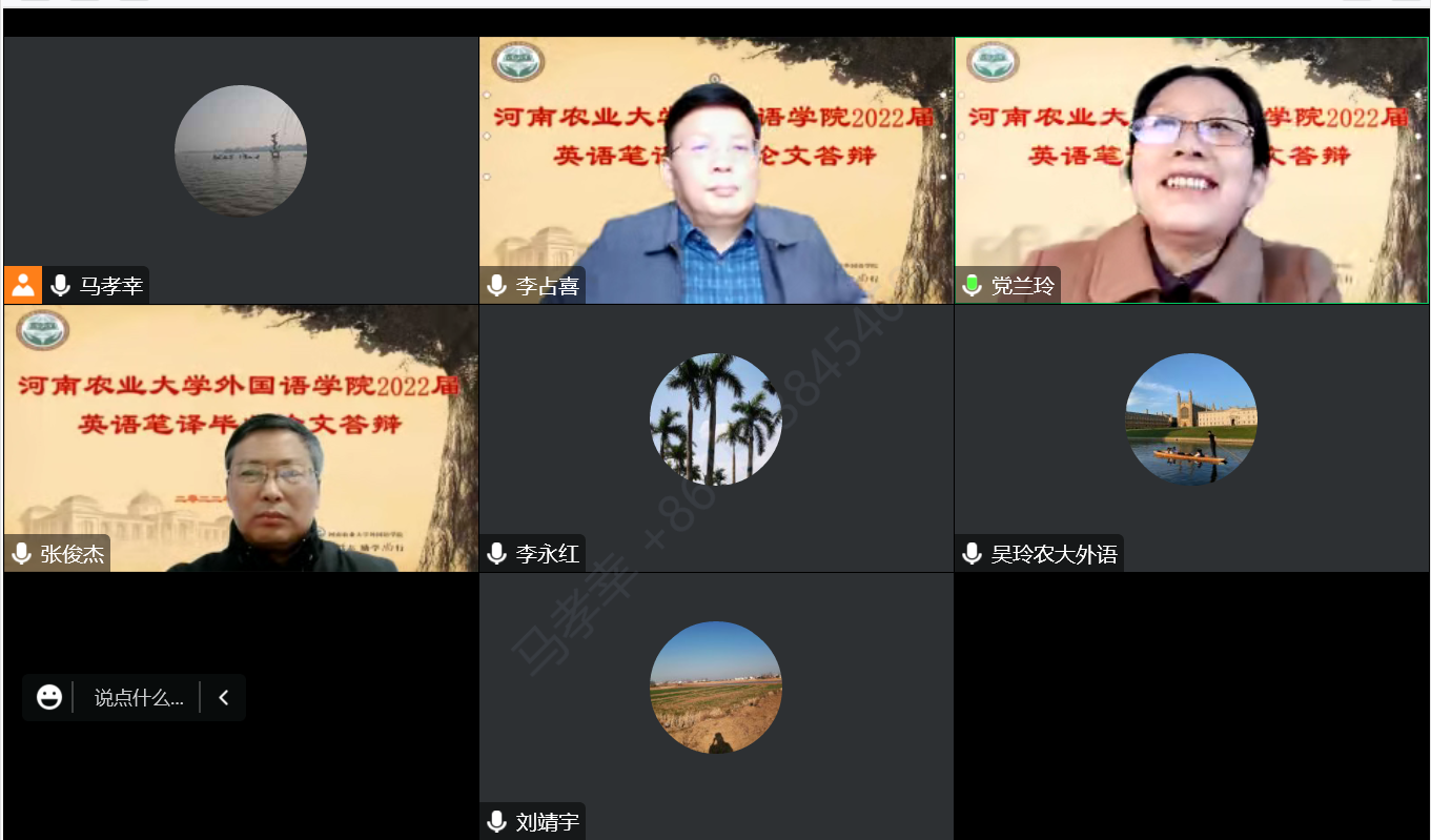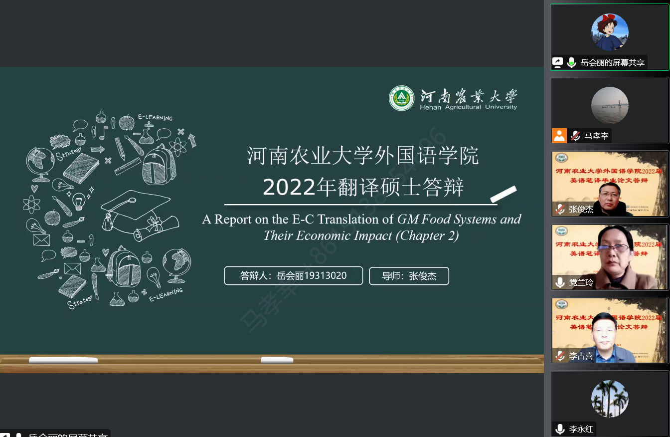 (通讯员:李倩楠,审稿:马孝幸)12月5日,河南农业大学外国语学院2022届英语笔译专业学位论文答辩通过线上的方式顺利举行。此次答辩特邀华北水利水电大学党兰玲教授担任答辩委员会主席,华南农业大学李占喜教授以及我院张俊杰教授及刘靖宇教授、李永红副教授、吴玲副教授三位硕士生导师担任答辩委员,马孝幸老师担任答辩委员会秘书。共有4名学生参与本次毕业论文答辩。2021级、2022级研究生观摩旁听。
