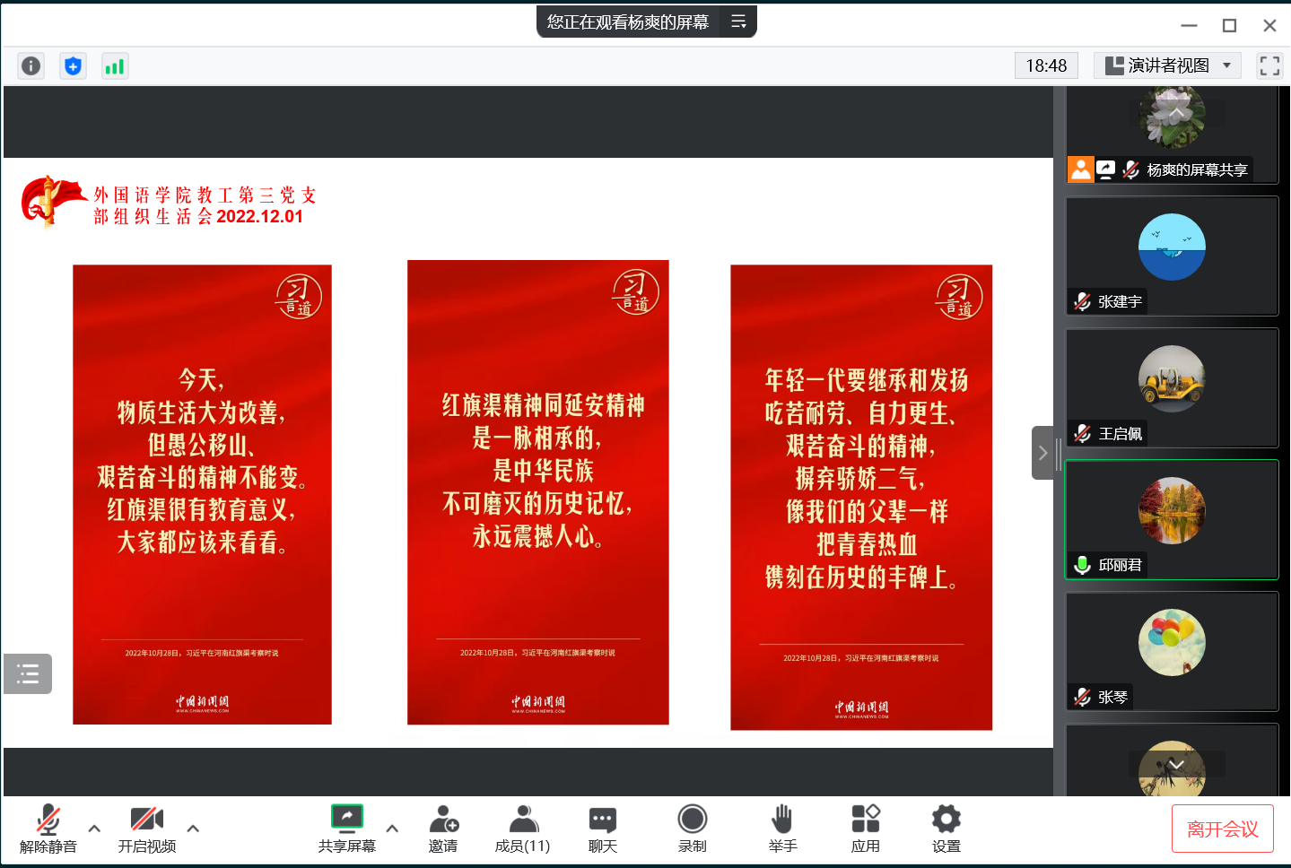 本网讯(审稿:王启佩 供稿:陈桃)为深入学习贯彻党的二十大精神,深刻学习领会习近平总书记视察安阳重要讲话精神。近日,外国语学院4个教工党支部和5个学生党支部以线上线下相结合的方式,召开以“深入学习习近平总书记视察安阳重要讲话精神,大力弘扬红旗渠精神”为主题的专题组织生活会,学院班子成员以普通党员的身份参加所在支部的组织生活会。