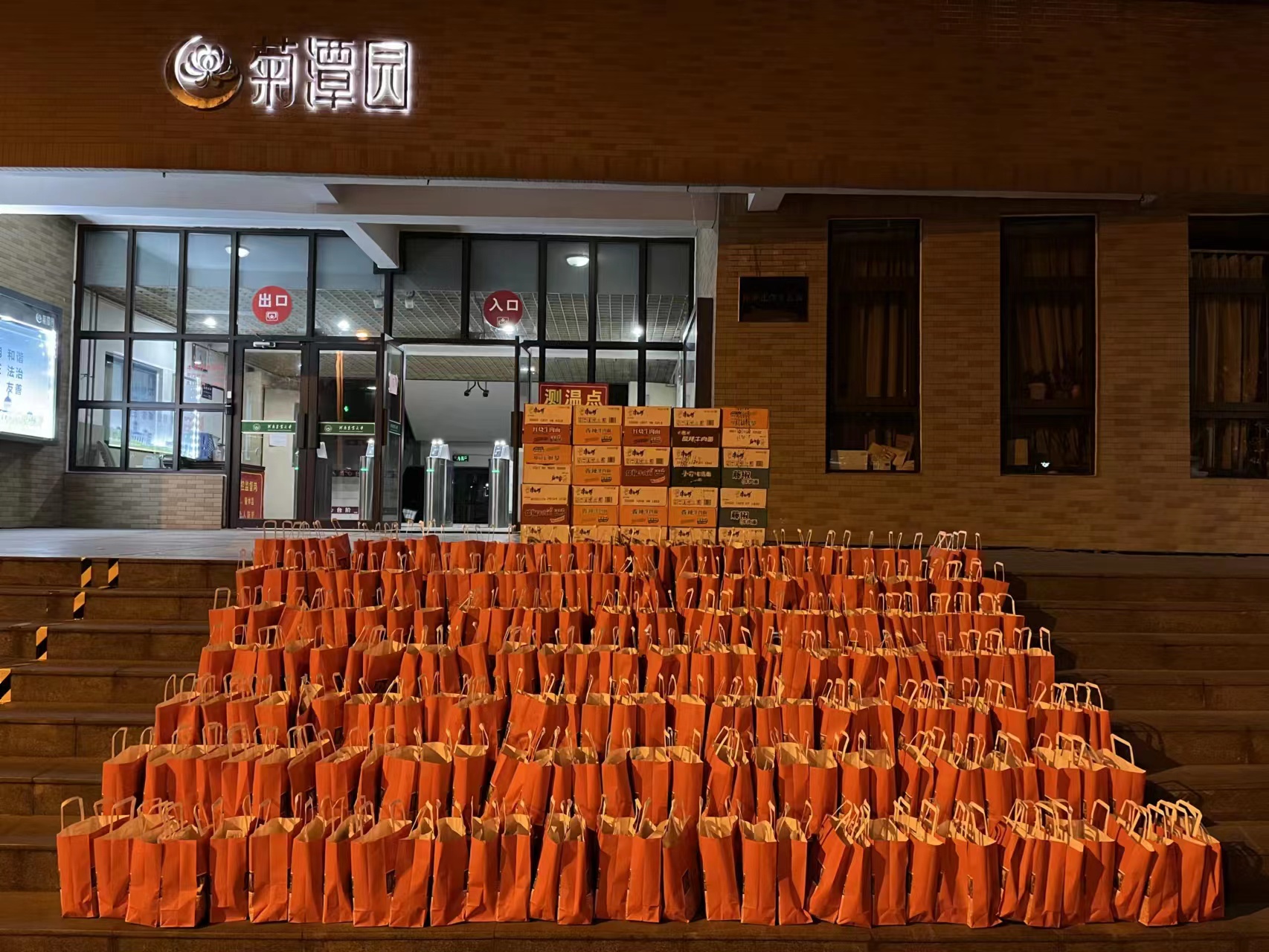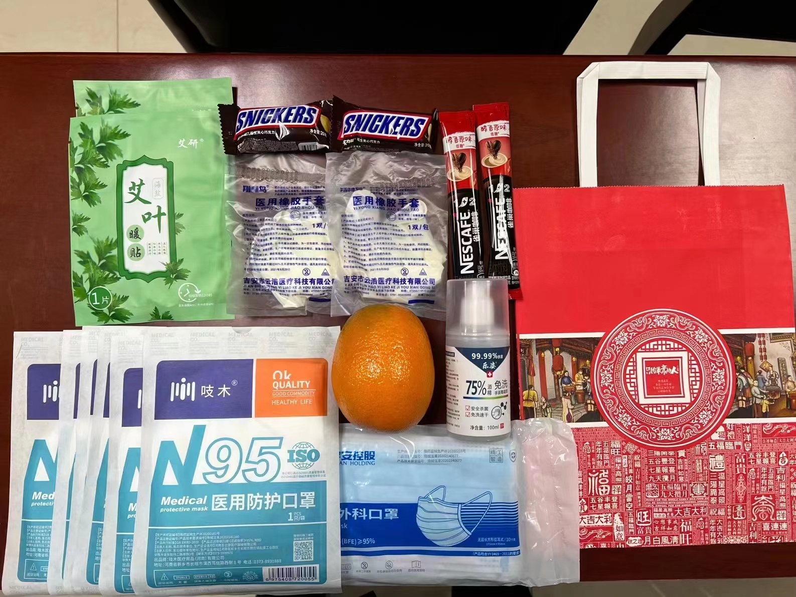 冯超老师代表学院向全体考研学子送上了关怀与祝福,希望考研学子在最后关键时刻稳扎稳打,沉着应考,用最佳的状态成就最好的自己。他为所有留校考研学子送上考研十八件套大礼包,有提神醒脑、保持体力的咖啡、巧克力、面包、牛奶、鸡蛋等元气套餐,还有全套防护、健康保障的N95口罩、手套、酒精凝胶等防疫套装,更有寓意“心想事成”美好祝愿的幸运甜橙。同学们也纷纷表示,会带着学院的关心与祝福轻装上阵,给自己的考研之路交上一份满意的答卷。