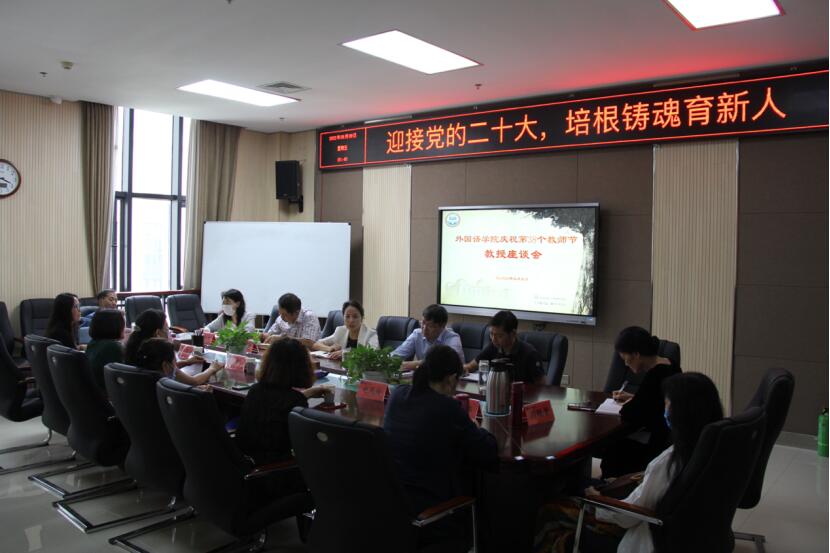 (审稿 王启佩 供稿 冯超)9月9日下午,在第38个教师节即将来临之际,外国语学院召开以“迎接党的二十大,培根铸魂育新人”为主题的庆祝教师节教授座谈会。院党委书记王燕萍、院领导班子成员和学院教授代表参加了会议,院长张俊杰教授主持会议。