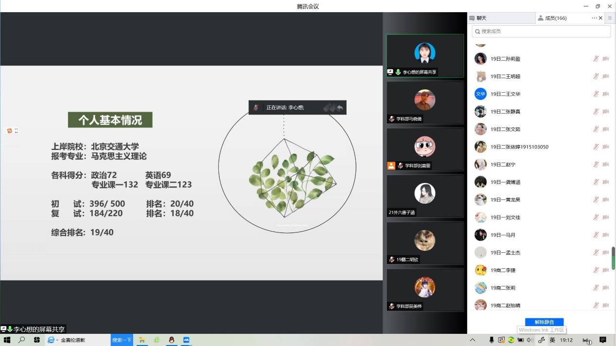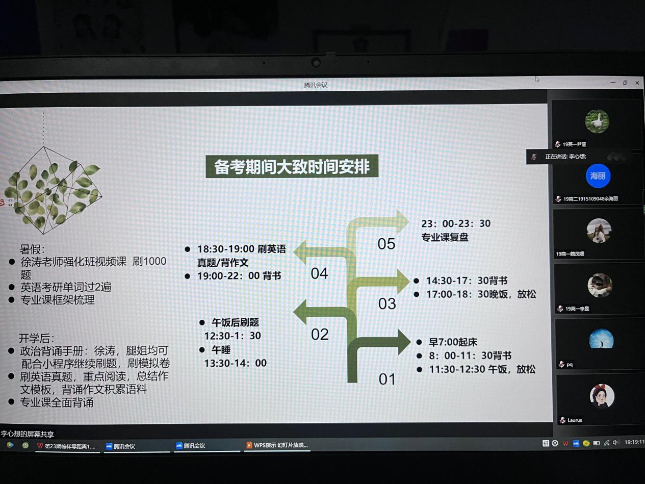 本网讯(审稿:陈桃 供稿:张仪婷)为夯实学院学风建设,营造良好的考研氛围,外国语学院于5月19日晚上七点召开了线上榜样零距离之考研经验分享交流会。本次会议邀请了外国语学院考研成功的7位学生代表分享她们的经验。19级、20级学生参与此次分享会。会议由外国语学院学科部吴美桦主持。