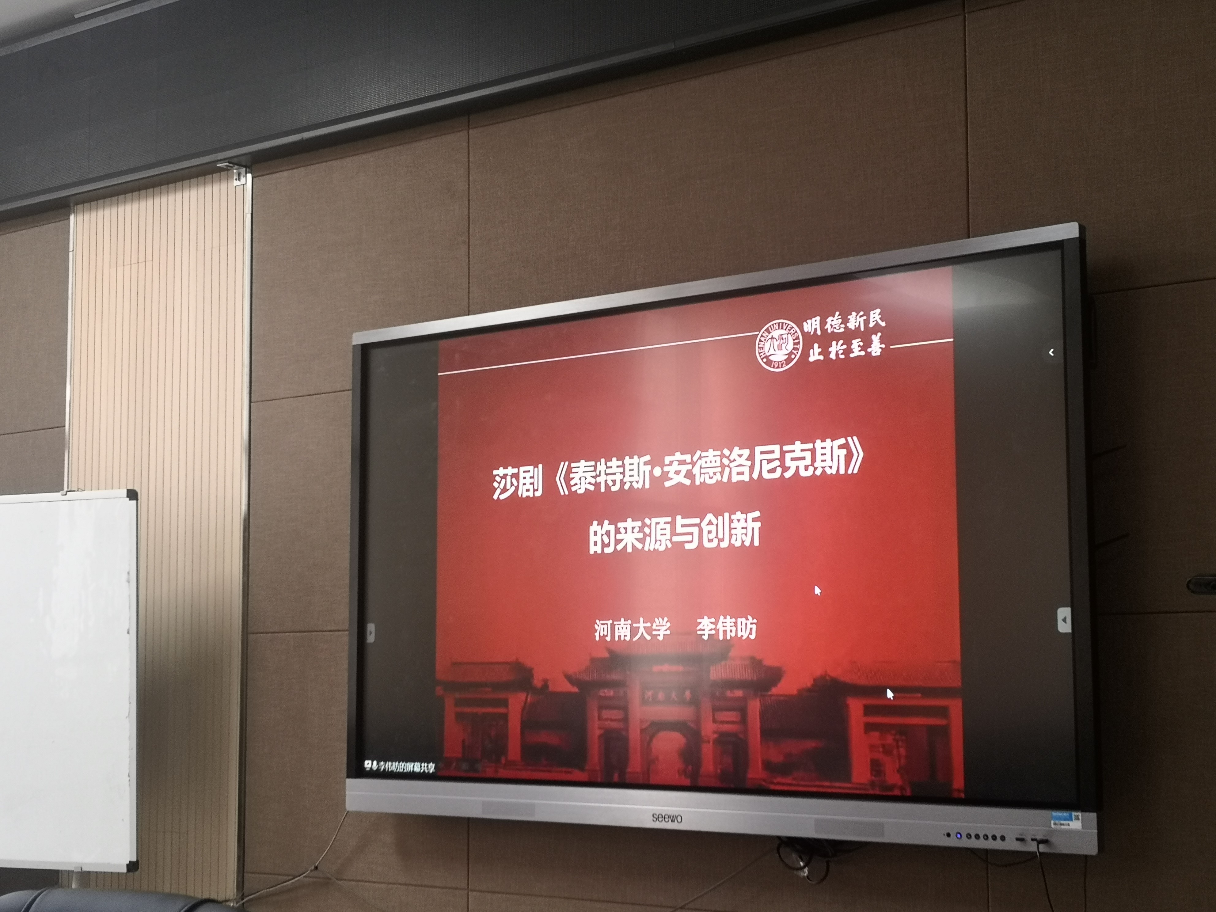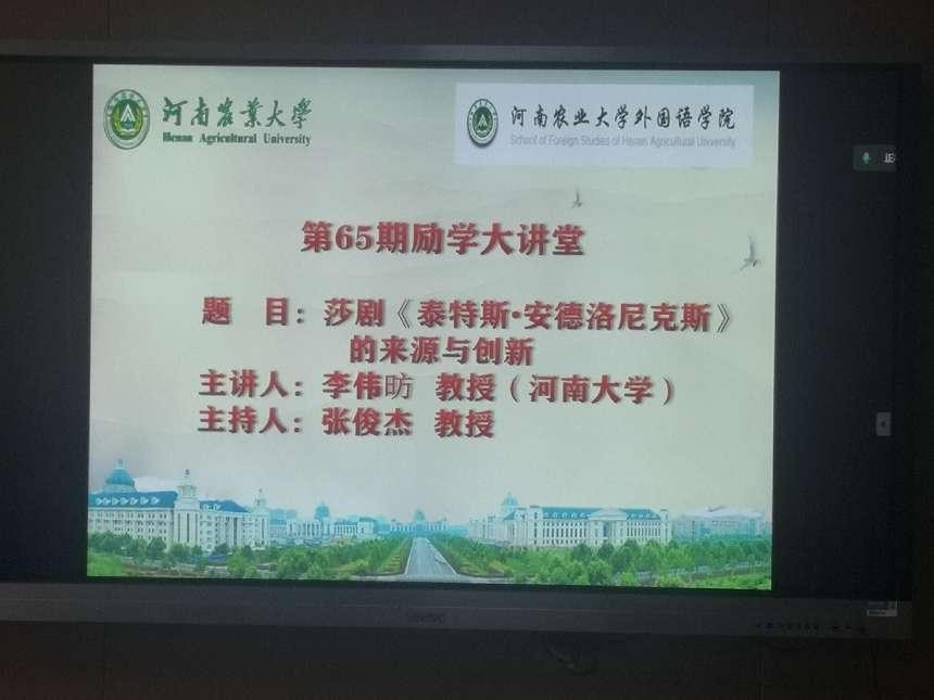 (通讯员:马孝幸) 5月3日下午,河南大学博士生导师李伟昉教授应邀做客外国语学院第65期励学大讲堂,并做了题为“< 泰特斯·安德洛尼克斯>:来源与创新”的讲座。讲座由外国语学院院长张俊杰主持,院师生代表和全国各地学者通过线上、线下的方式聆听了此次讲座。