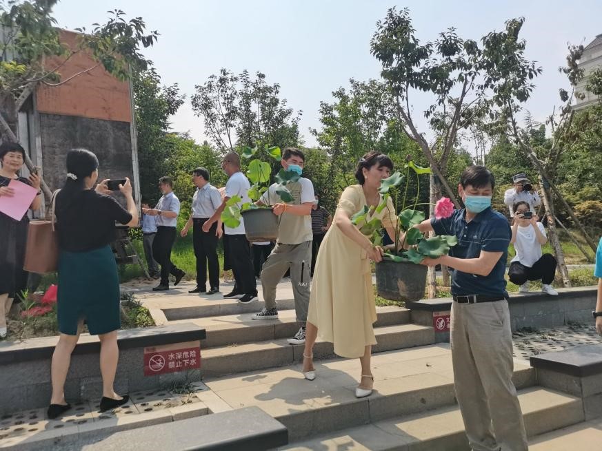 周口校友会会长王文信做代表发言,他表示荷花作为周口市花,寓意坚韧不屈、清洁美好,希望母校未来如荷花一样“中通外直,不蔓不枝,香远益清,亭亭净植”。随后,由校友代表进行荷花捐赠,副校长康相涛向校友颁发捐赠证书及纪念徽章。期间,外国语学院教工代表协同周口校友代表以搬运接力的方式将含苞待放的120盆荷花,安置在学校北湖,至此,捐赠仪式圆满结束。