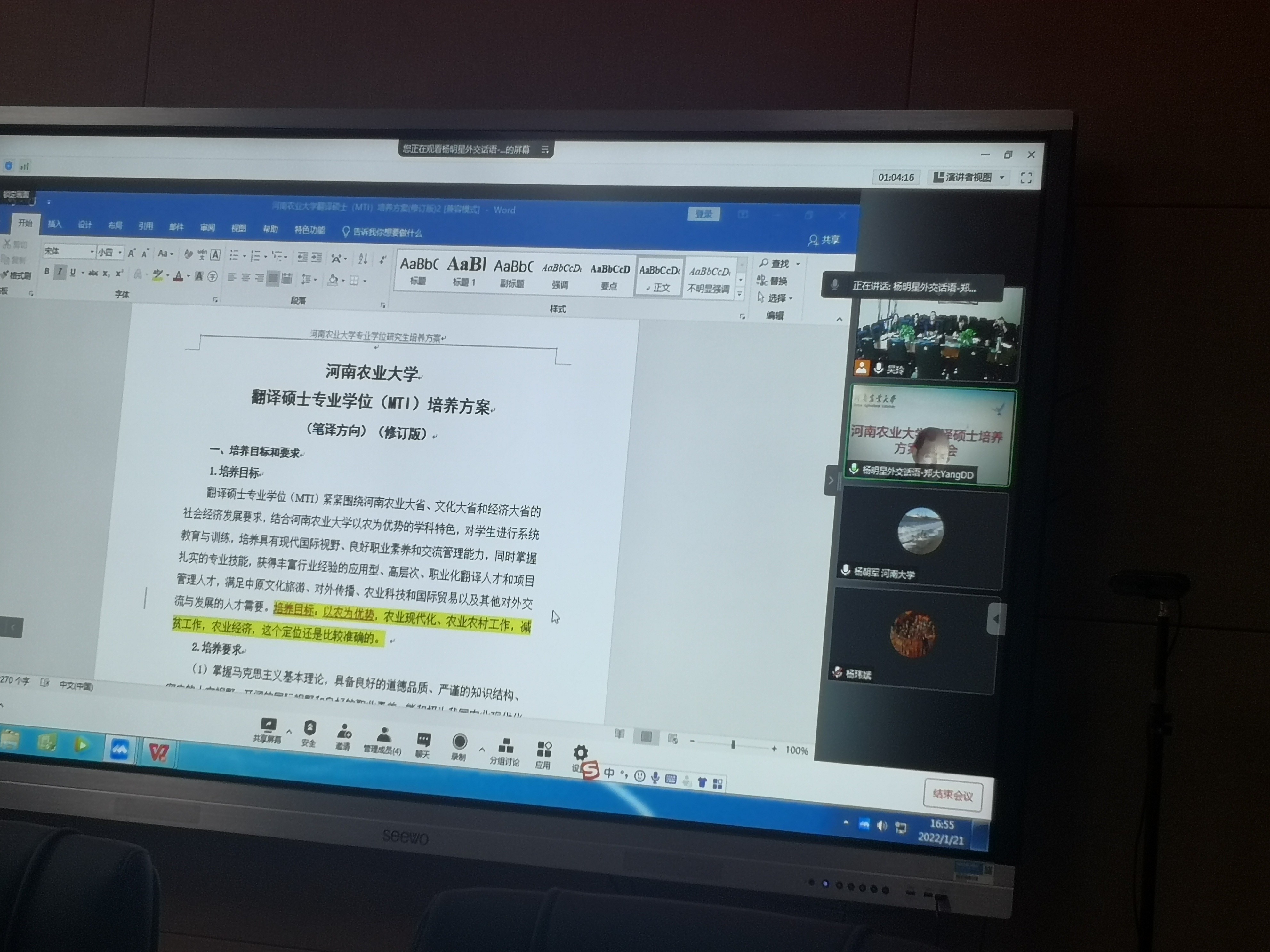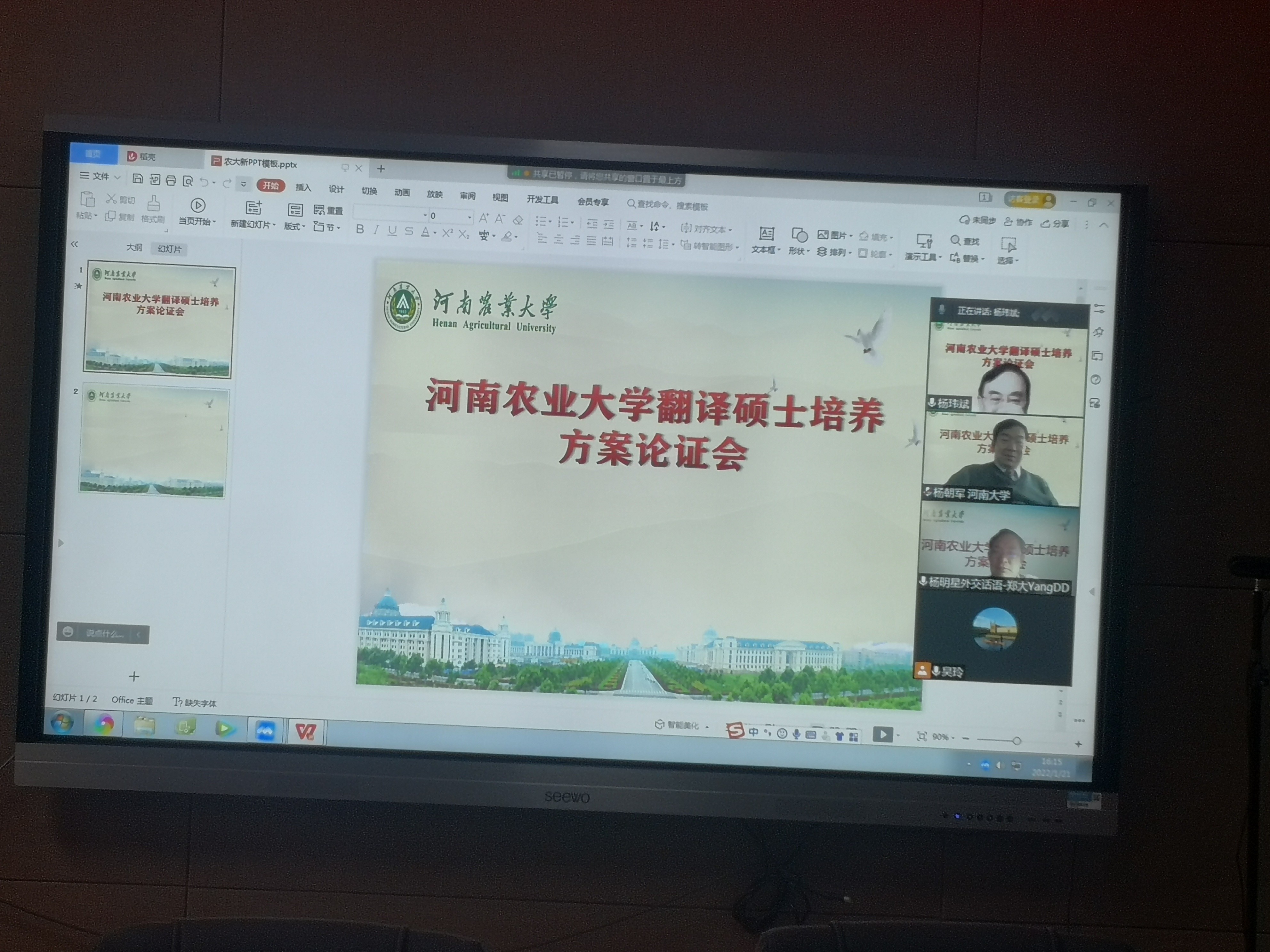 (通讯员:马孝幸)日前,翻译硕士专业学位(简称MTI,下同 )研究生培养方案修订论证会在繁塔楼A320会议室举行。河南省委外事办原一级巡视员、副主任杨玮斌、河南大学外语学院院长杨朝军教授、郑州大学中国外交话语研究院院长、杨明星教授担任论证会专家成员。外国语学院院长张俊杰、副院长张卫东、部分导师代表和MTI中心负责人参加,会议由张俊杰主持。会议采取线上线下相结合的方式进行。
