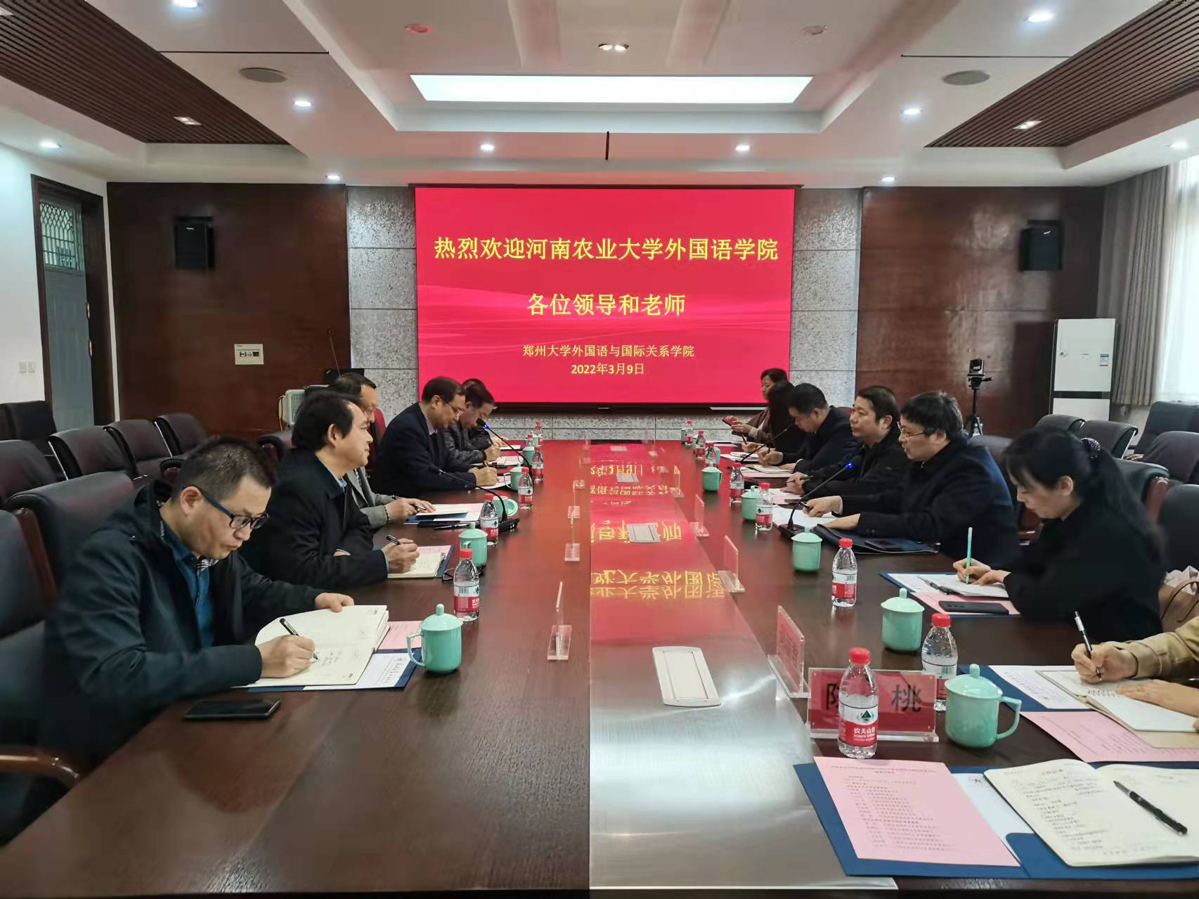 2022年3月9日下午,在党委书记邓振营、院长张俊杰带领下,领导班子成员和部分系部室主任、团委副书记一行8人,赴郑州大学外国语学院与国际关系学院进行调研。