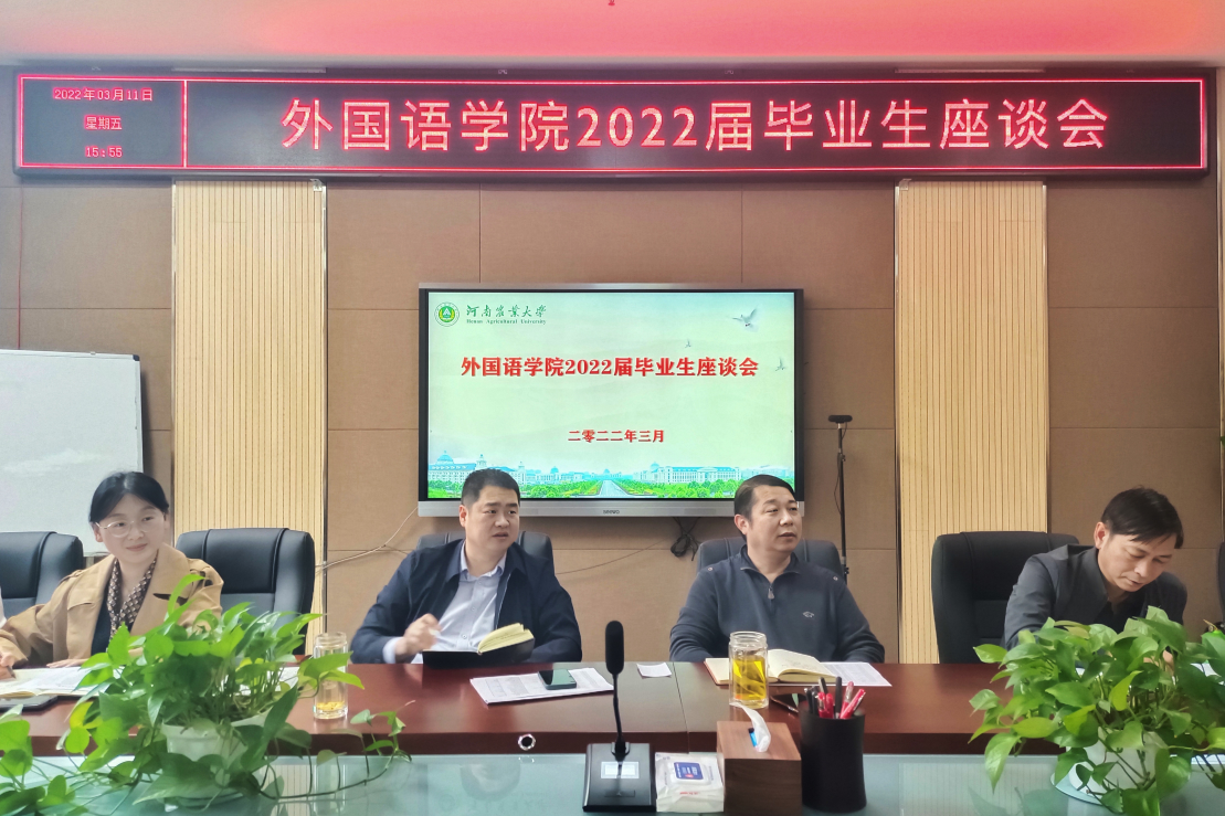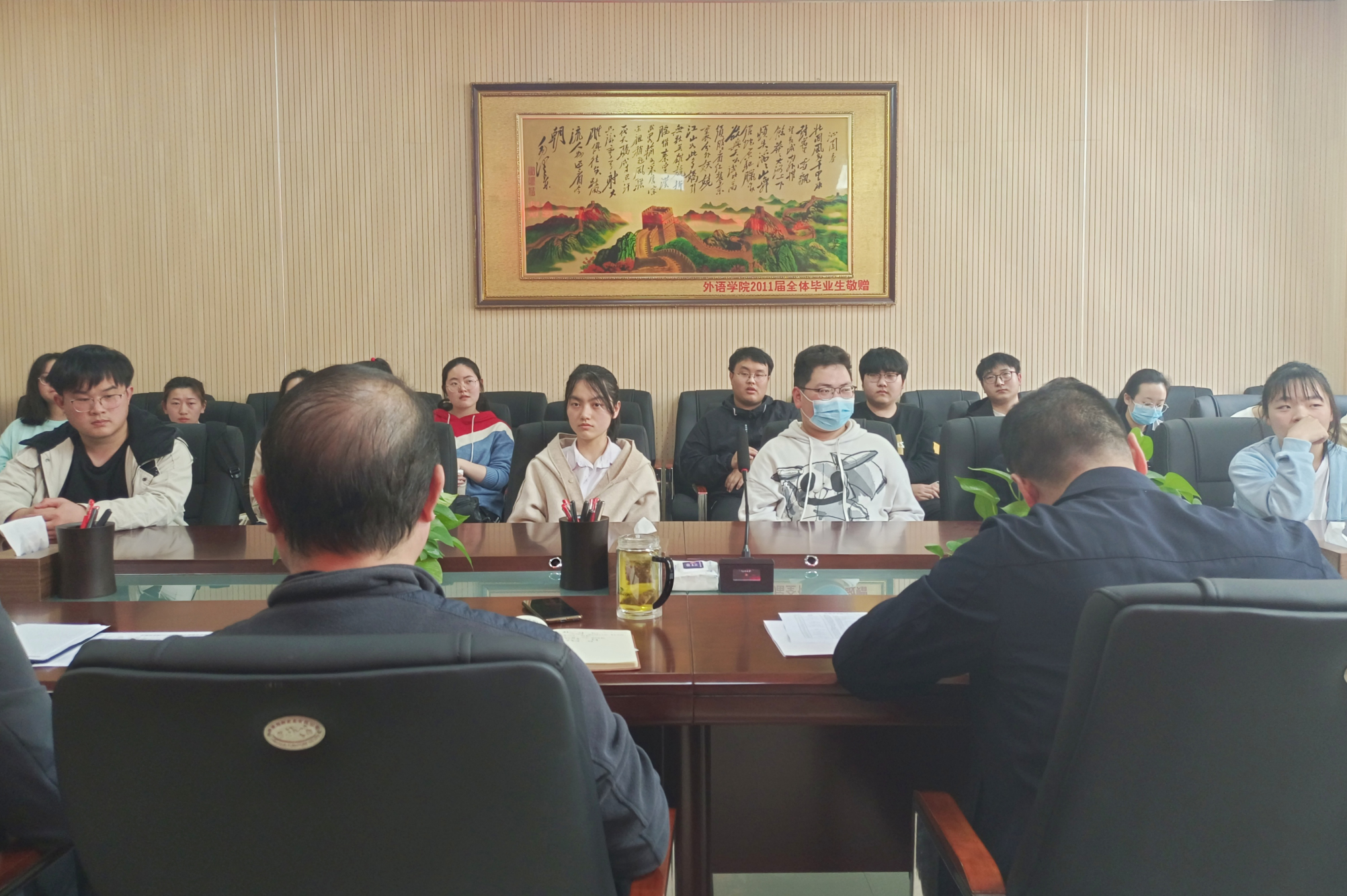 本网讯(审稿:陈桃 供稿:黄湘)为全面掌握毕业生考研及就业情况,为毕业生提供指导,解决实际问题,3月11日下午,外国语学院于龙子湖校区繁塔楼A320会议室召开了毕业生座谈会。会议由院党委副书记王启佩主持召开,院班子成员、年级辅导员、毕业班学生代表参加会议。