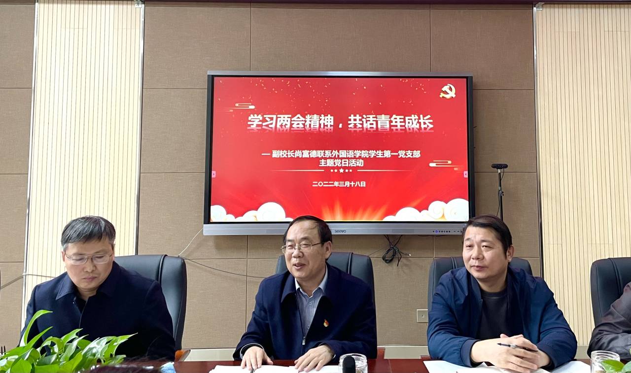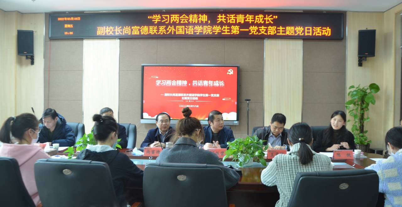 本网讯(审稿:王启佩 供稿:陈桃)3月18日,外国语学院学生第一党支部在龙子湖校区A320会议室开展以“学习两会精神,共话青年成长”为主题的党日活动。副校长尚富德作为党支部联系校领导出席此次活动。外国语学院班子成员列席会议。会议由学生第一党支部书记陈桃主持。