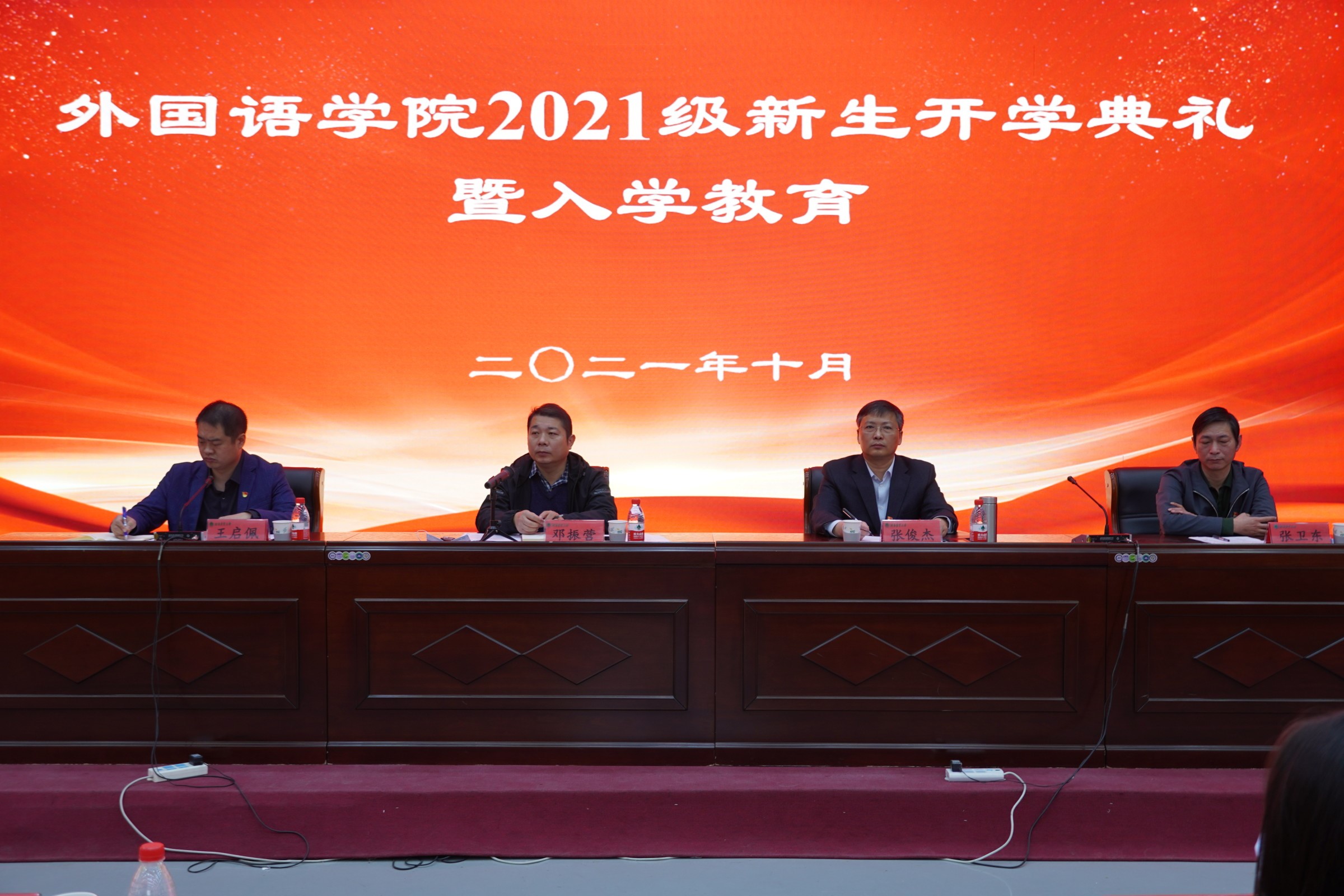 本网讯(审稿:王启佩 供稿:陈桃)10月19日上午,外国语院2021级新生开学典礼暨入学教育在龙子湖校区繁塔楼AB间大教室一隆重举行。院班子成员、各系主任、新生班主任以及全体辅导员出席会议。2021级全体本科生及研究生参加。会议由院党委副书记王启佩主持。