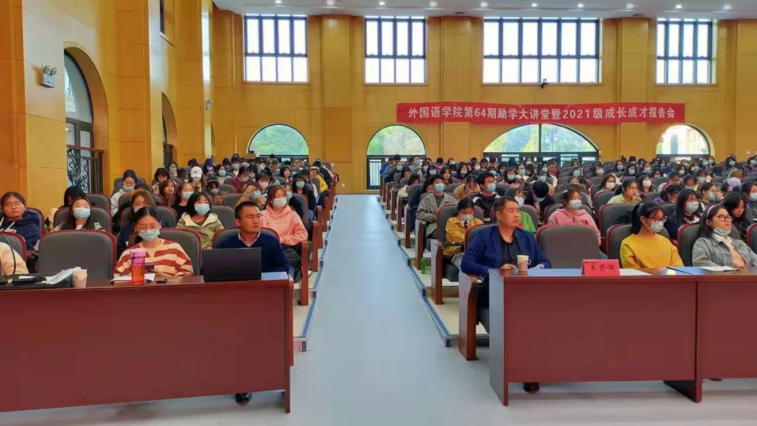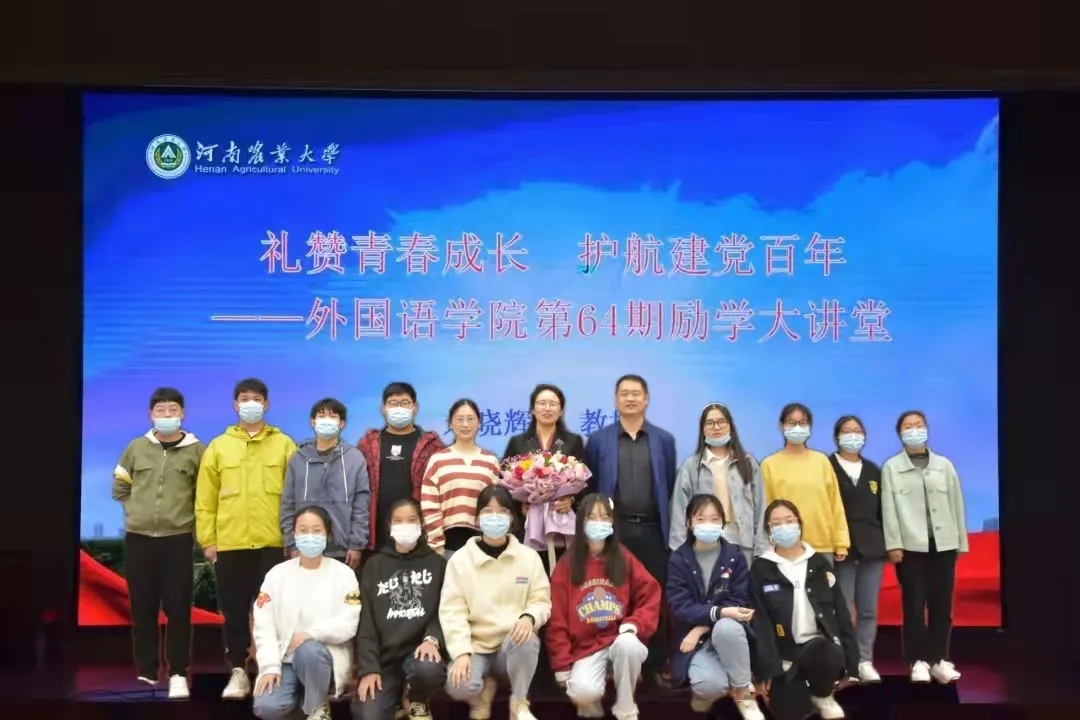 本网讯(审稿:冯超 供稿:黄湘)为引导我院21级新生树立远大志向,培养崇高品质,10月30日下午,外国语学院于龙子湖校区图书馆报告厅举办了第64期励志大讲堂。我院诚邀河南中医药大学护理学院刘晓辉教授为我院21级学子作以“礼赞青春成长,护航建党百年”为主题的教育专题报告会,本次报告会由院党委副书记王启佩主持,院团委副书记陈桃、冯超携全体本科和研究生新生出席会议。