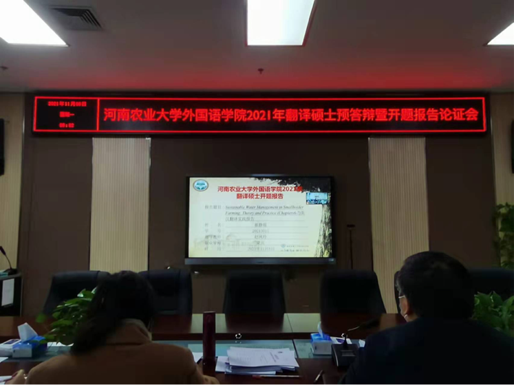 11月8日上午,外国语学院在龙子湖校区繁塔楼A320、A324两个教室同时举行翻译硕士开题报告论证会。河南师范大学外国语学院赵文静教授、郑州大学外国语与国际关系学院副院长王志伟教授、校国际合作处处长屠克教授、张俊杰、李喜芬、陈洁、李永红等全体研究生导师出席本次会议,28名研究生参与开题报告汇报,2021级MTI研究生旁听会议。因疫情防控,会议主席王志伟教授、主席赵文静教授、豆涛老师进行指导,以及部分学生通过网络会议进行开题报告汇报。