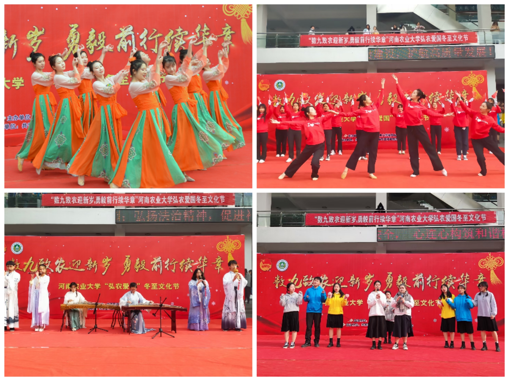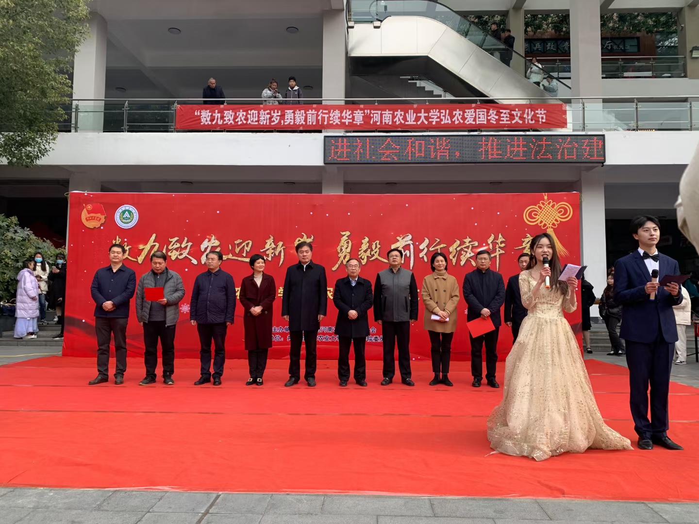 本网讯(审稿:王启佩 供稿:陈桃)为深入学习党的十九届六中全会,弘扬中华优秀传统文化,落实立德树人根本任务,营造“弘农爱国”浓郁氛围,推进“三品”主题教育活动, 12月17日下午,由校团委主办,外国语学院承办的河南农业大学“数九致农迎新岁,勇毅前行续华章”冬至文化节在龙子湖校区一餐厅广场隆重举行。校党委副书记、工会主席李成吾、副校长尚富德等莅临现场指导,校党委宣传部、学生工作部、研究生工作部、校工会、外国语学院等单位负责同志出席活动。