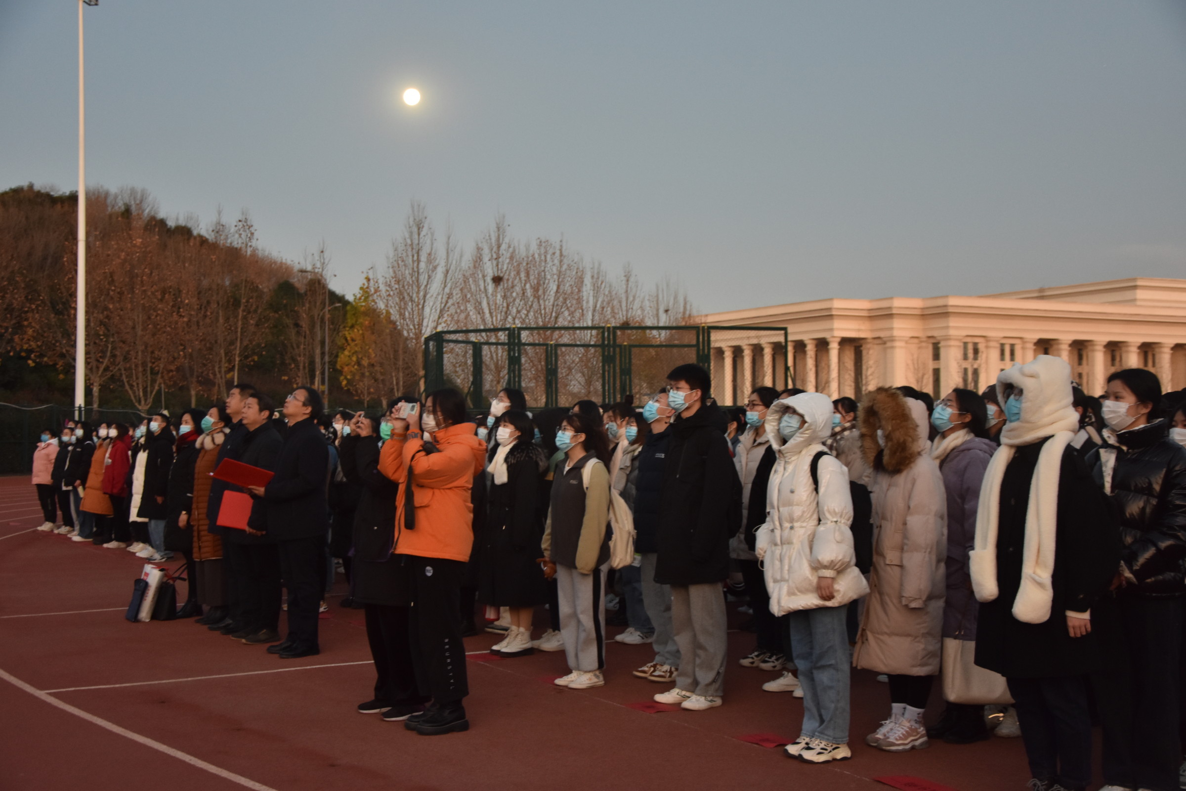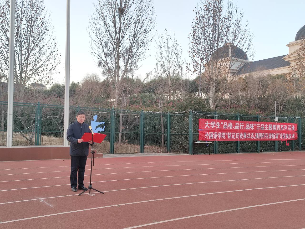 本网讯(审稿:陈桃 供稿:黄湘 )12月20日上午,外国语学院于龙子湖校区田径场举行了以“铭记历史乘壮志,强国有我谱新篇”为主题的升国旗仪式。院领导班子携全院学生参加此次仪式。本次升旗仪式由院长张俊杰主持。